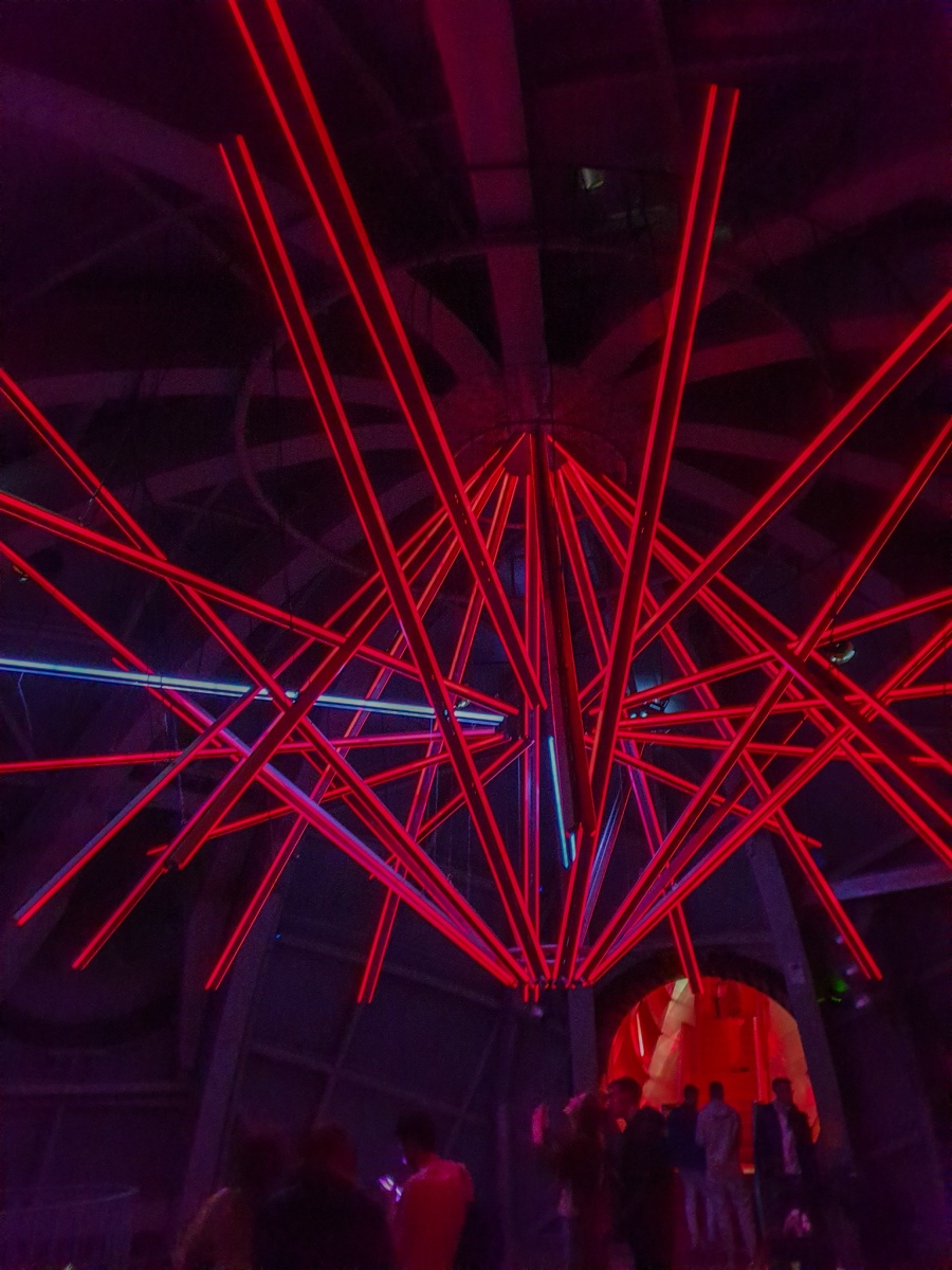 Následne sa presúvam z najspodnejšej gule, ktorú tvorili dve poschodia stálej expozície, schodmi a eskalátormi smerom navrch, kde na mňa všadeprítomné projekcie pôsobia priam futuristicky. Zastavím sa tak v jednej miestnosti, aby som bola svedkom niekoľkominútovej svetelnej šou. Raz kráčam hore, inokedy nadol, no vždy si musím dávať pozor pod nohy, keďže miestami sa ponorím až do úplnej tmy. Sem-tam sa mi objaví aj samotná vnútorná konštrukcia stavby a tak sa cítim ako v sci-fi filme. Prechod nasledujúcimi dvomi guľami bol naozaj zaujímavý.
