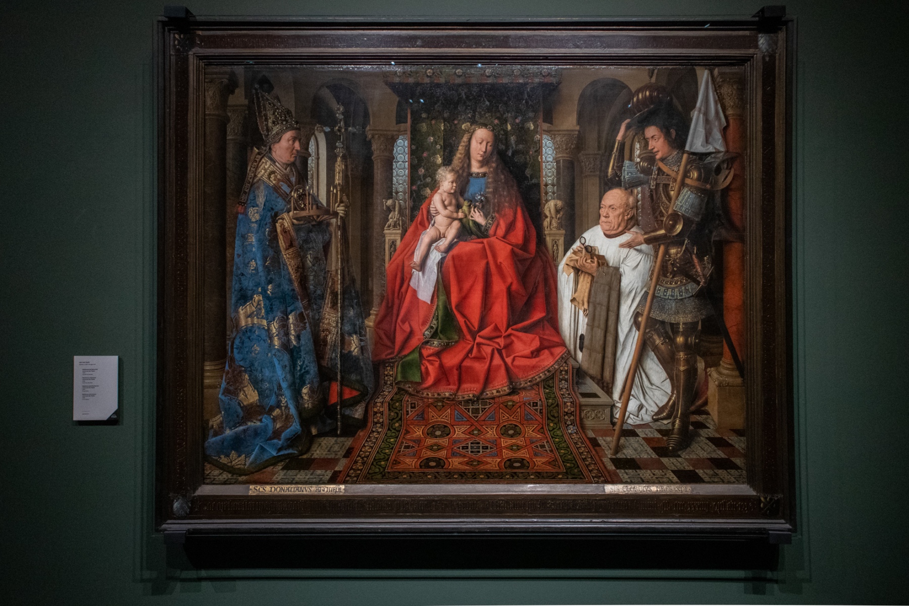 Druhý van Eyckov významný obraz je Madona s kanonikom Jorisom van der Paele. Tento obraz minulý rok preskúmala Antverpská univerzita špeciálnou röntgenovou metódou (MA-XRPD), pri ktorej zistili zaujímavé informácie o materiáloch, ktoré van Eyck použil vo svojich prácach, o výrobe farieb podľa starých receptov a poskytol tak pohľad do ich procesu starnutia v priebehu času. O pár miestností ďalej som mala možnosť si vzhliadnuť film dokumentujúci proces skúmania tejto maľby. Ale vrátim sa naspäť k samotnej maľbe. Významná je detailným realizmom a zobrazením materiálov, čo môžeme vidieť na drapériách, ako aj odrazoch na Jorisovom brnení a prilbe. Okrem toho maľba ukrýva množstvo detailov a symbolov, ktoré som si mohla prezrieť a prečítať si o nich na interaktívnom panely v miestnosti.