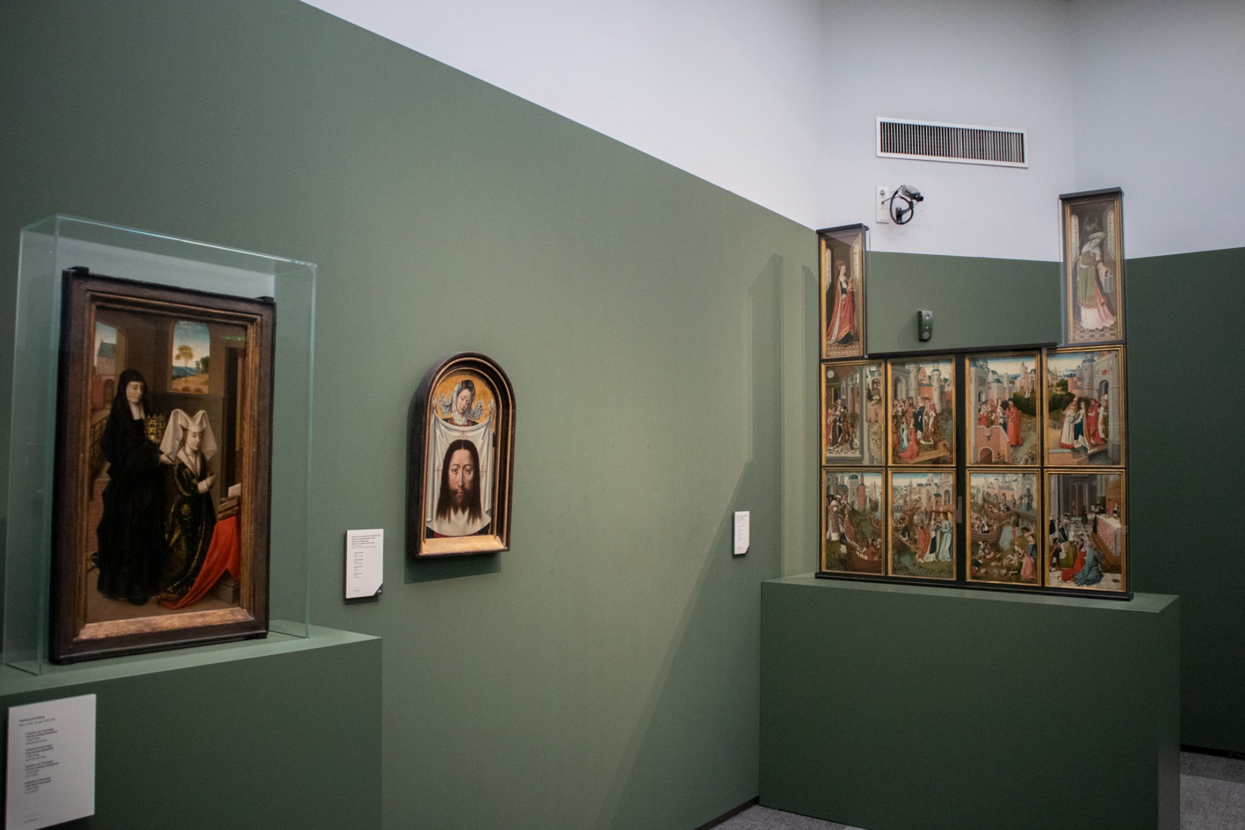 Zľava: Petrus Christus, Isabella portugalská so svätou Alžbetou, ± 1457/1460, olej na paneli; Majster legendy o Uršuli (Pieter Casembroodt?), Svätá Veronika, ±1495, olej na paneli; Majster legendy o Uršuli (Pieter Casembroodt?), Legenda o svätej Uršuli, ± 1482, olej na paneli (foto: KUNSTARTUM)