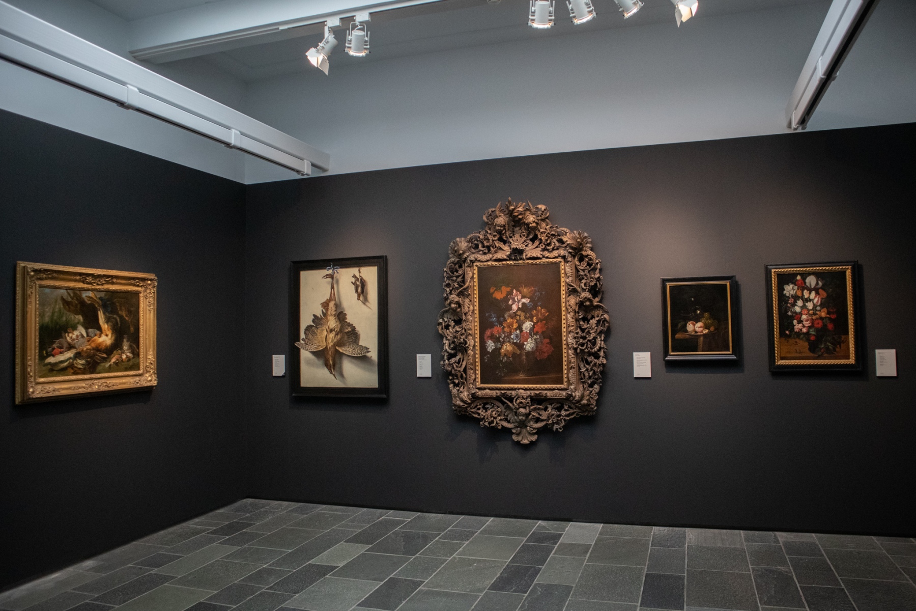 Zľava: Joannes Fijt, Zátišie s loveckou korisťou; Frans van Cuyck de Myerhop, Zátišie s vtákmi, 2. polovica 17. storočia, olej na plátne; Gaspar Peeter Verbruggen II. (maliar) Laurent van der Meulen (sochár), Zátišie s kvetinami, ± 1700, olej na plátne; Isaac Denies, Zátišie s ovocím a pohárom vína, 2. polovica 17. storočia, olej na plátne; Okruh Roelanta Saveryho, Zátišie s kvetinami, 1. polovica 17. storočia, olej na paneli (foto: KUNSTARTUM)