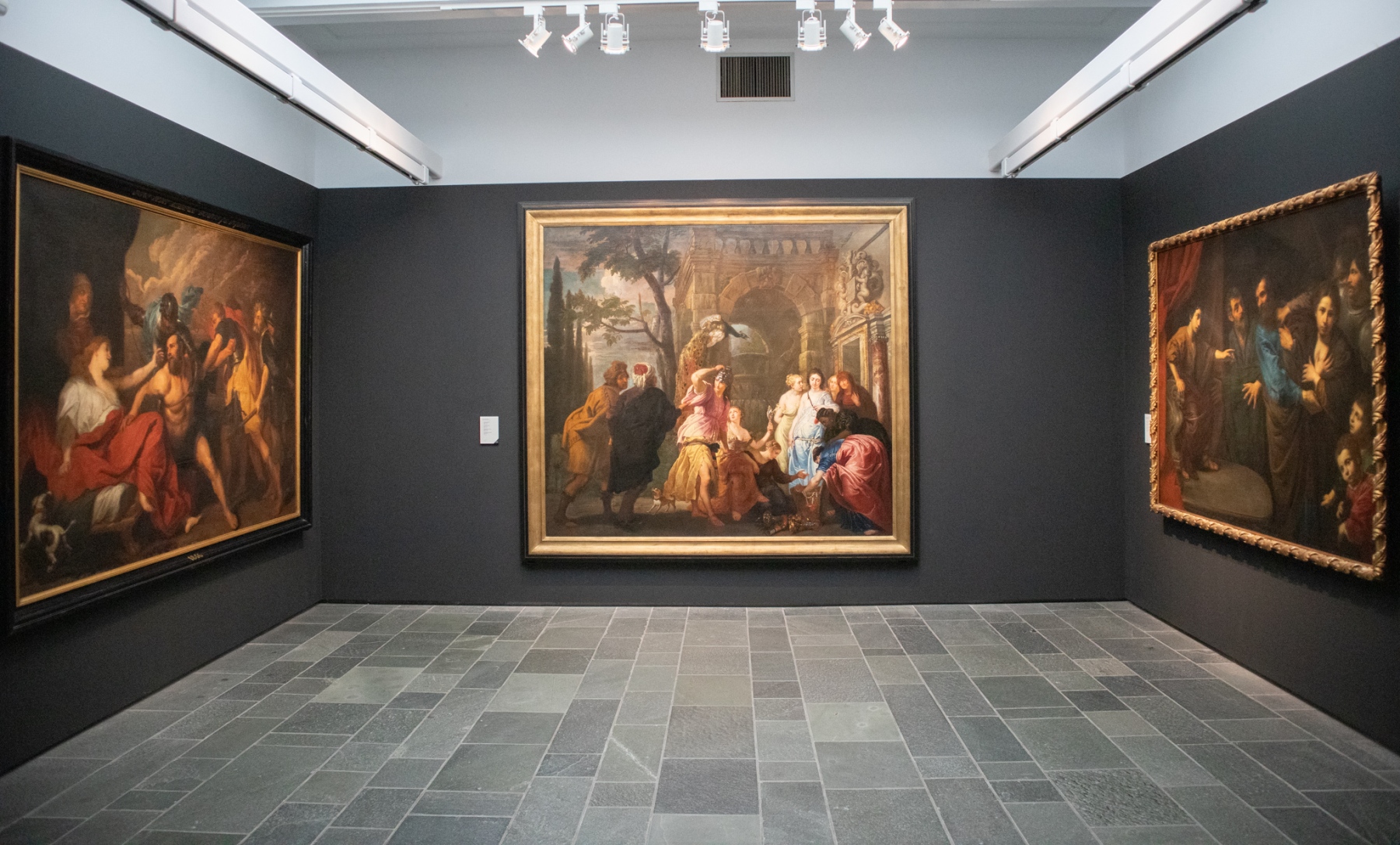 Zľava: Kópia podľa Anthona van Dycka, Samson a Dalila, po roku 1627/1630, olej na plátne; Erasmus Quellinus II., Achilles medzi Lykomédovými dcérami, 1643, olej na plátne; Kópia podľa Valentina de Boulogne, Súd proroka Daniela, po roku 1625, olej na plátne (foto: KUNSTARTUM)