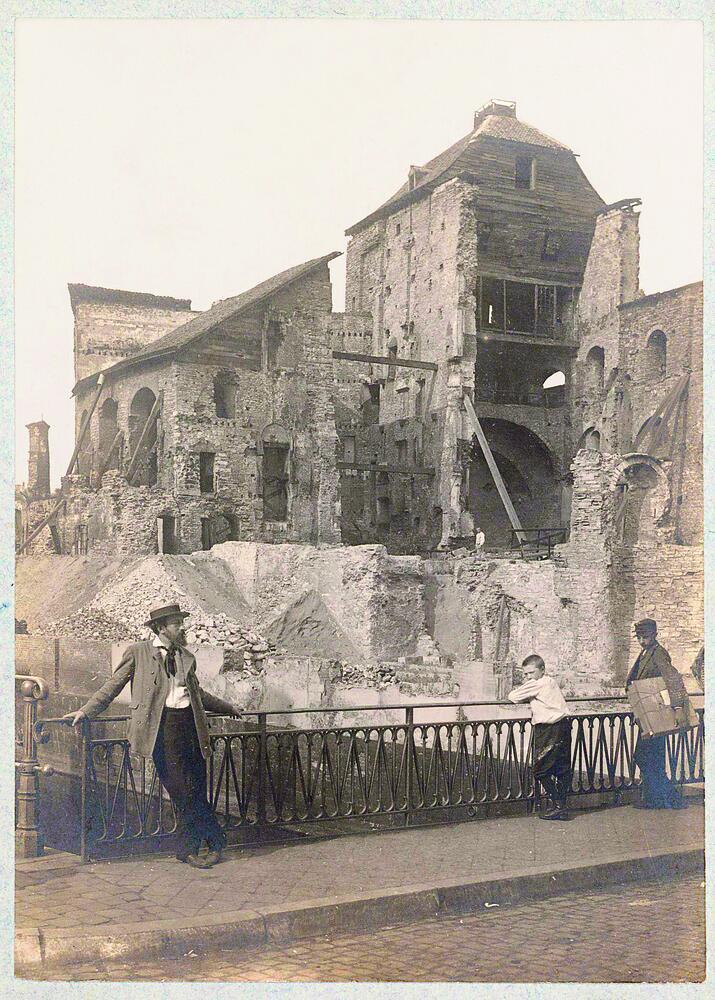 Hrad Gravensteen počas reštaurovania, okolo roku 1900, foto Edmond Sacré, Gent, mestský archív (foto: https://historischehuizen.stad.gent/en/castle-counts/history-and-stories)