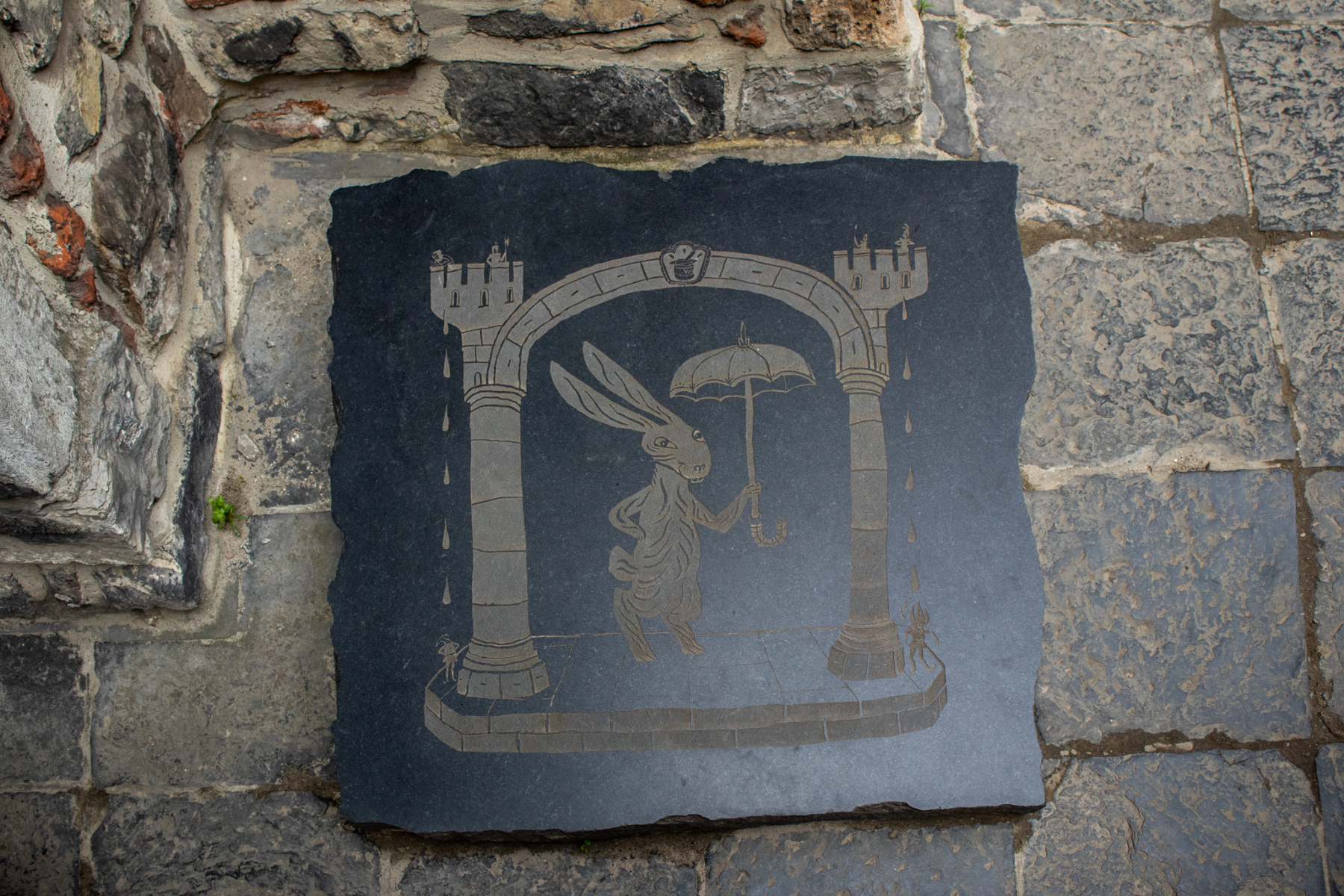 Ilustrácia zajaca na kameni, ktorý je „sprievodcom“ na hrade Gravensteen v podobe hlasu audiosprievodcu. (foto: KUNSTARTUM)