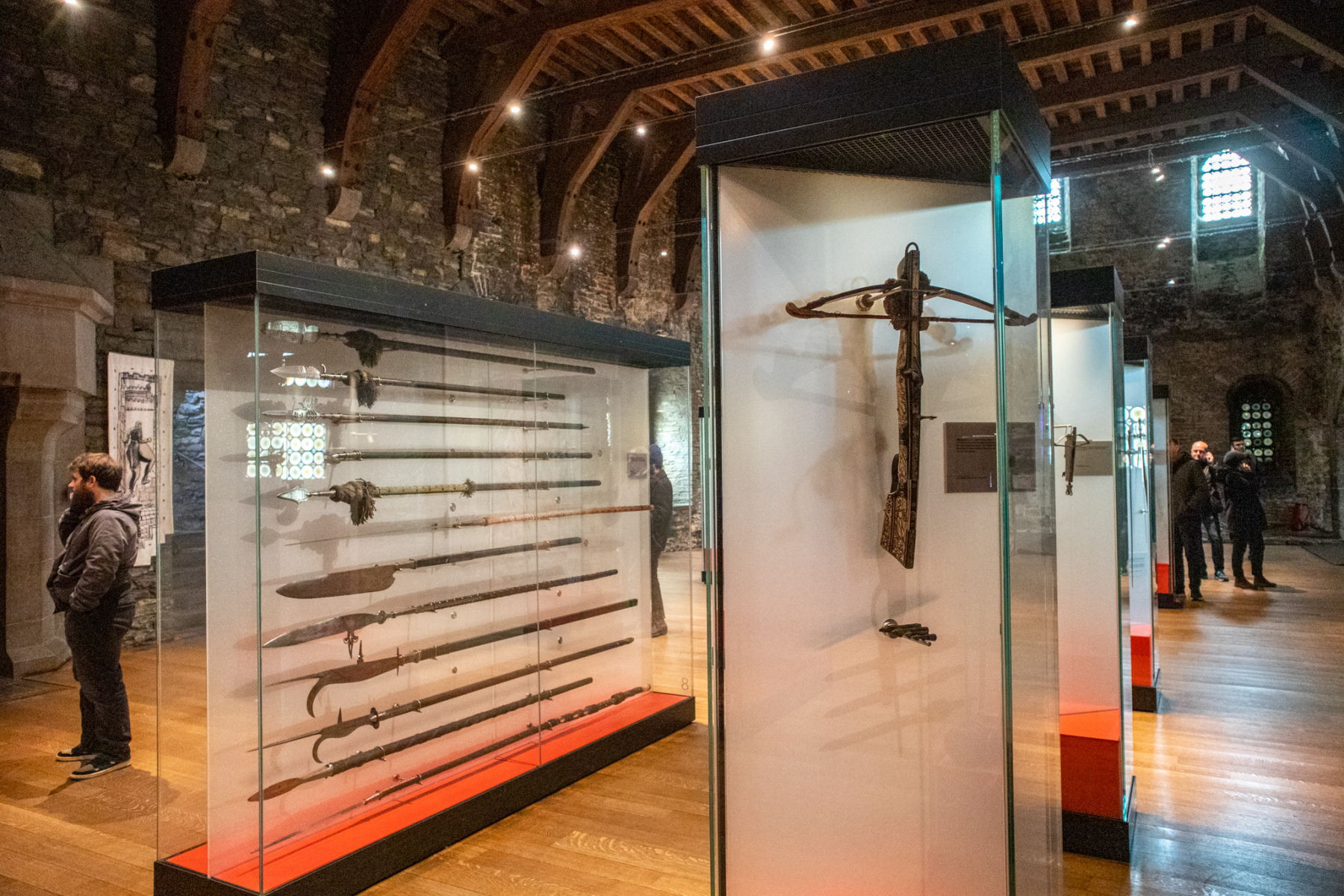 Po vypočutí si úvodnej nahrávky, som znovu vyšla na denné svetlo, kde som nasávala energiu z mohutných kamenných múrov, ktoré boli bezprostredne vedľa mňa a zadívala som sa hore na vežu. Nasledovala som inštrukcie zo zvukového sprievodcu. Kráčala som po kamenných schodoch, kde som sa dostala k obytným miestnostiam hradu Gravensteen. Obklopená neomietnutým kamenným murivom som skúmala detaily architektúry a jej prvkov, ktoré tu boli neprehliadnuteľné. Hoci tu boli aj krby, kameň bol natoľko studený a sály natoľko veľké, že ich nedokázali plnohodnotne vyhriať, takže dlhodobo tieto priestory neboli grófmi obývané a pri najbližšej možnej príležitosti si zvolili iné sídlo. Gravensteen sa tak stal miestom rôznych využití – ako som sa dozvedela zo sprevádzajúceho hlasu. Pomaly som sa dostala k prvej expozícii a to zbierke stredovekých zbraní. Prešla som sa pomedzi vitríny s rôznymi zbraňami ako meče, sekery, oštepy, kuše a mnohé ďalšie. Meče a oštepy boli naozaj obrovské a ťažké, čo ma prinútilo uvažovať, akou silou disponovali vtedajší bojovníci.