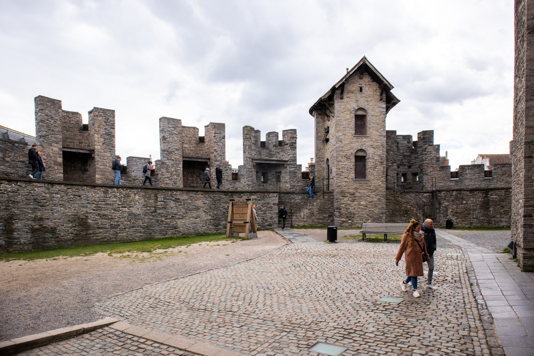 Od zbierky zbraní som schodmi vystúpila nad obytné priestory – na centrálnu vežu Gravensteenu. Tu sa mi naskytol dych berúci výhľad na historické mesto Gent. Pomedzi rôzne odtiene terakotovej a sivej farby striech domov tu vyčnievali kamenné, gotické veže neďalekých kostolov, ktorých je v Gente niekoľko. Za typickými flámskymi domami bolo možné v diaľke vidieť už aj budovy modernejšej architektúry, ktoré však nijako nenarúšali. Poprechádzala som sa popri cimburí a pokochala sa výhľadom na Gent z každej strany. Následne som pokračovala v prehliadke ďalej.