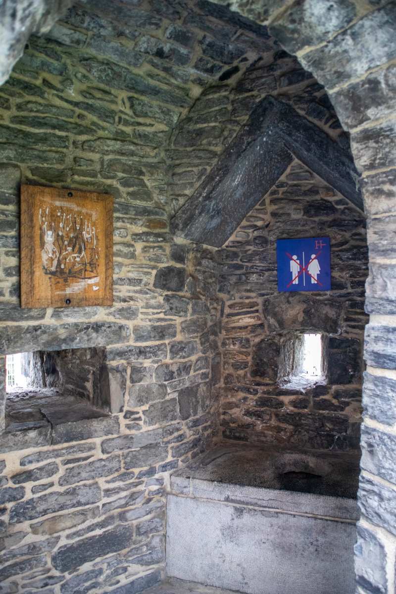 Zľava som sa prechádzala po hradbe popri cimburí, ktoré bolo prerušované bartizanmi. V jednom z nich sa nachádzal príklad stredovekej toalety, ktorá bola prispôsobená tak, aby výkaly padali popri vonkajšej strane muriva rovno do vodnej priekopy.