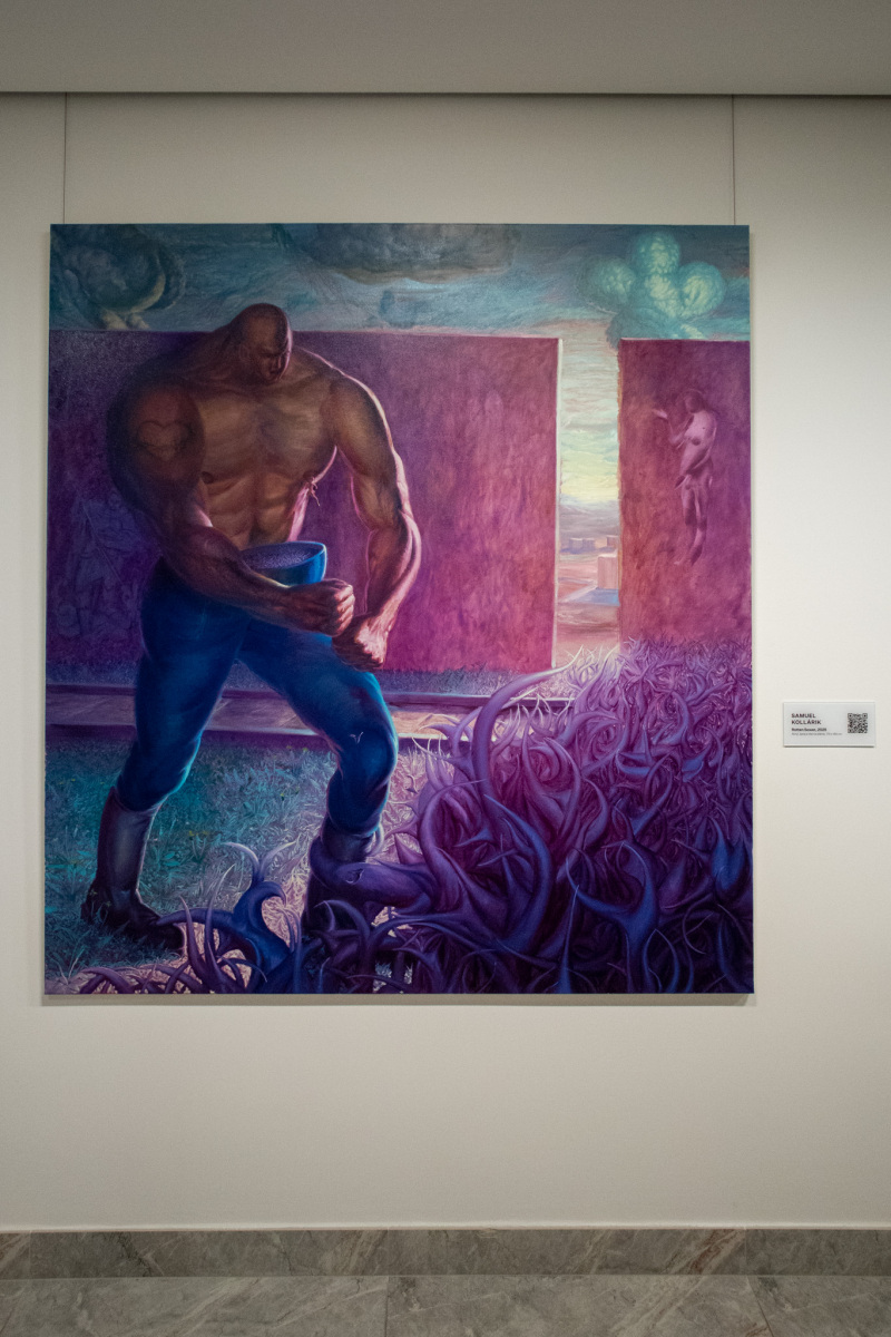 Adam Baník: In Drops of Sweat We Thrive, 2025, olej, akryl a olejový pastel na plátne, 120×170 cm. Táto maľba získala v súťaži Maľba roka 2025 2. miesto. (foto: KUNSTARTUM)