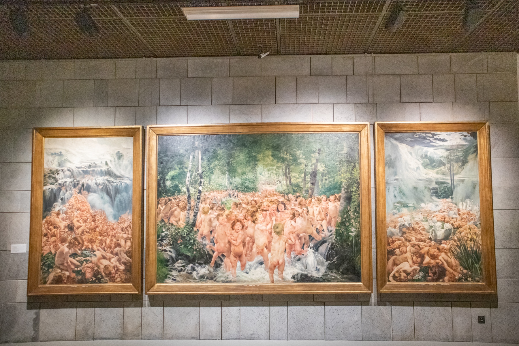 Léon Frederic: Potok. Ľavý panel: Ľadovec – horský potok; centrálny panel: Potok; pravý panel: Jazero – spiaca voda, 1890-1899, olej na plátne, 127,5x205 cm (ľavý a pravý panel) a 282x206 cm (stredný panel) (foto: KUNSTARTUM)