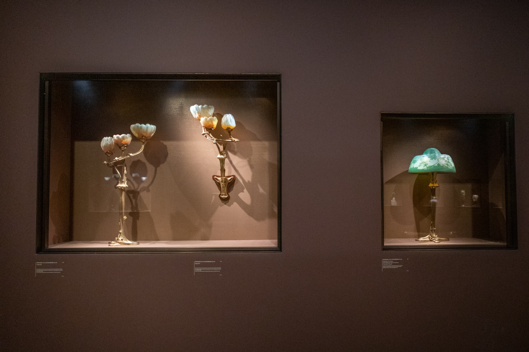 Úžitkové umenie v expozícii Fin-de-siècle, nachádzajúcej sa v podzemných podlažiach, 2022, Musées royaux des Beaux-Arts de Belgique, Brusel, Belgicko. Vľavo: Antonin Daum a Louis Majorelle: Lampa Magnólia, 1903, pozlátený a leštený bronz, tvarované a leštené dvojité sklo, 25x84,5 cm; vedľa: Nástenné svietidlo Magnólia, 1903, pozlátený a leštený bronz, tvarované a leštené dvojité sklo, 64 cm (foto: KUNSTARTUM)
