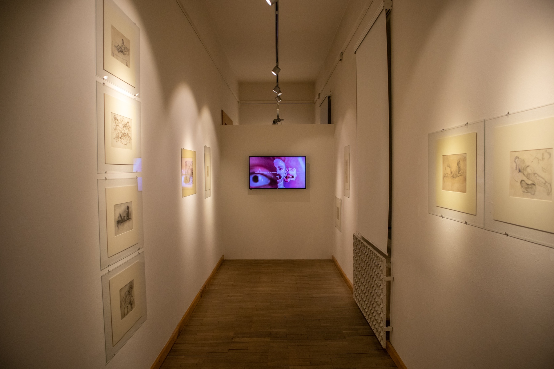 Pohľad do časti sekcie, kde na bočných stenách visia štúdie od Ladislava Medňanského a v strede na konci chodby sa nachádza video od Jana Matýseka „I Can be Real as You Can Dream“. Sekciu mala kurátorsky na starosti Zuzana Štefková. (foto: KUNSTARTUM)