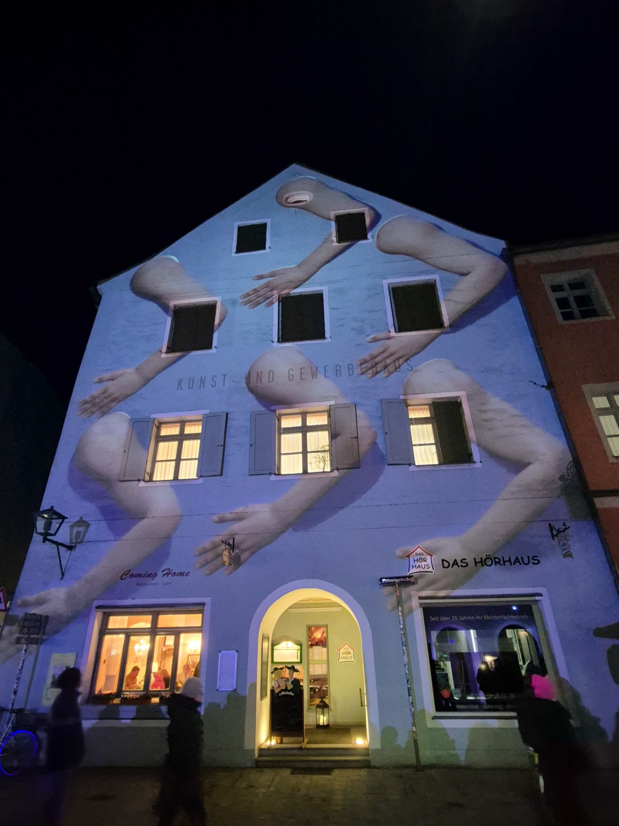 Clemens Rudolph: Kaliber, 2024, videomapping, RE.LIGHT festival, Ludwigstrasse 6, Regensburg (foto: KUNSTARTUM)