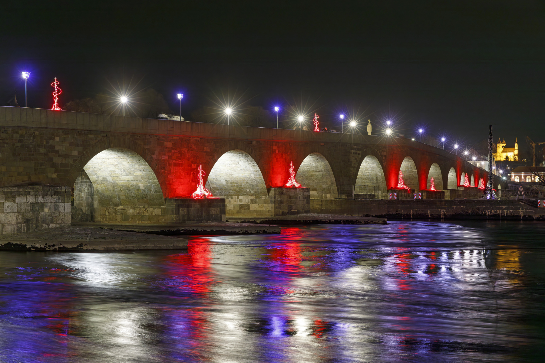 Båll & Brand, Tokyo Blue: Mother, 2024, svetelné objekty, RE.LIGHT festival, Steinerne Brücke, Regensburg (foto: Stadt Regensburg, Bilddokumentation)