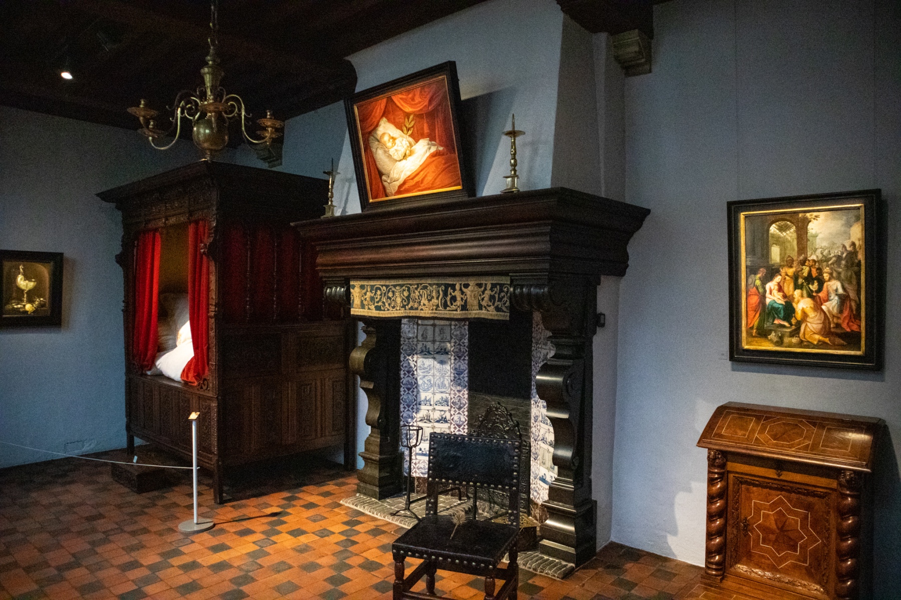 Naľavo od krbu sa nachádzala Rubensova posteľ s baldachýnom z dubového dreva. Posteľ by sa mohla zdať pre nás dosť nepohodlná a malá, no ľudia v tých časoch spávali v polosede, lebo sa verilo, že je to lepšie pre trávenie a krvný obeh.