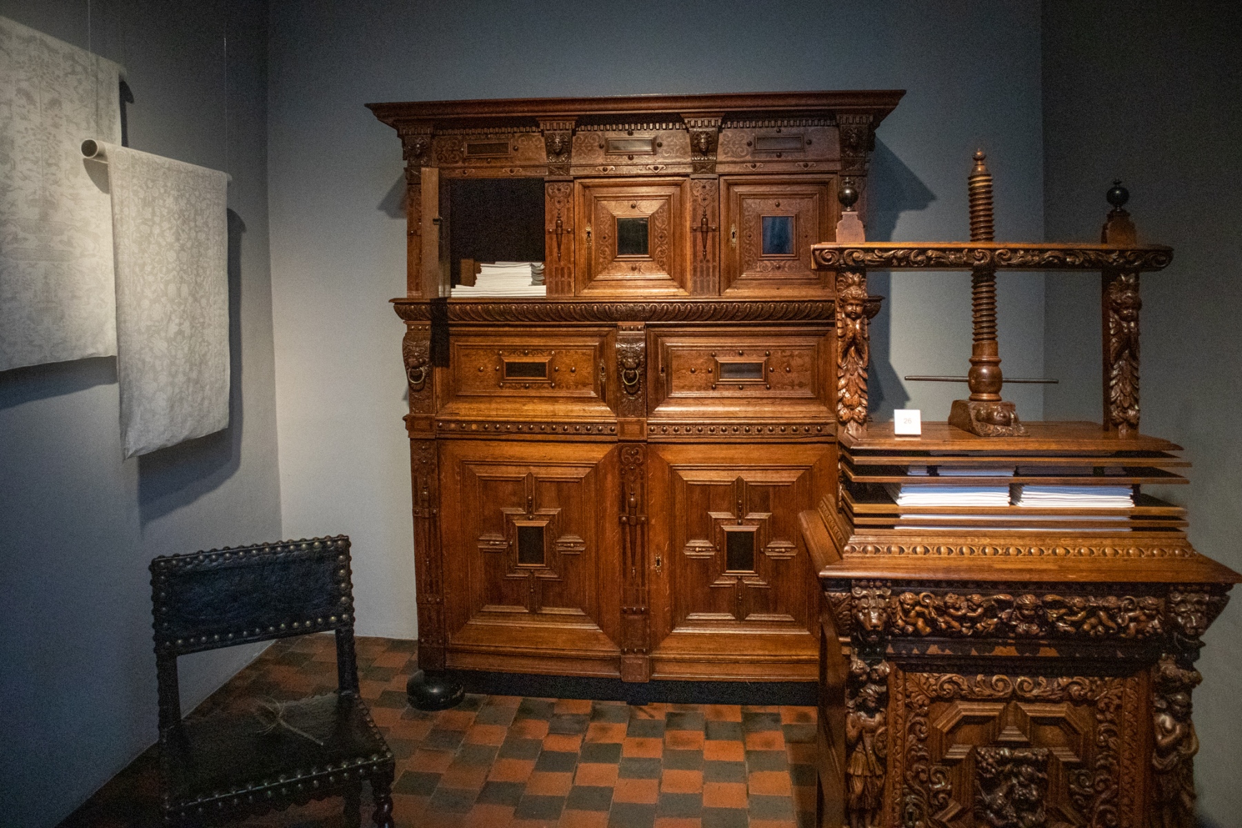 Z umeleckej komory som sa presunula po schodoch na prvé poschodie. V prvej miestnosti dominovali obrazy a objekty. Z nich spomeniem dubovú skriňu dyhovanú ebenovým drevom a zdobenú maľovanými medenými panelmi s mytologickými výjavmi podľa Rubensových kompozícií od Victora Wolfvoeta – antverpského majstra, ktorý sa špecializoval na kopírovanie Rubensových kompozícií v malom formáte. Tento druh nábytku – umelecké skrine s mnohými zásuvkami a tajnými priehradkami, často vyrobené z drahých drevín slúžiace na úschovu malých predmetov z umeleckej zbierky alebo zbierok rarít, ako boli antické mince, fosílie a iné, sa nachádzal vo viacerých miestnostiach Rubensovho domu.