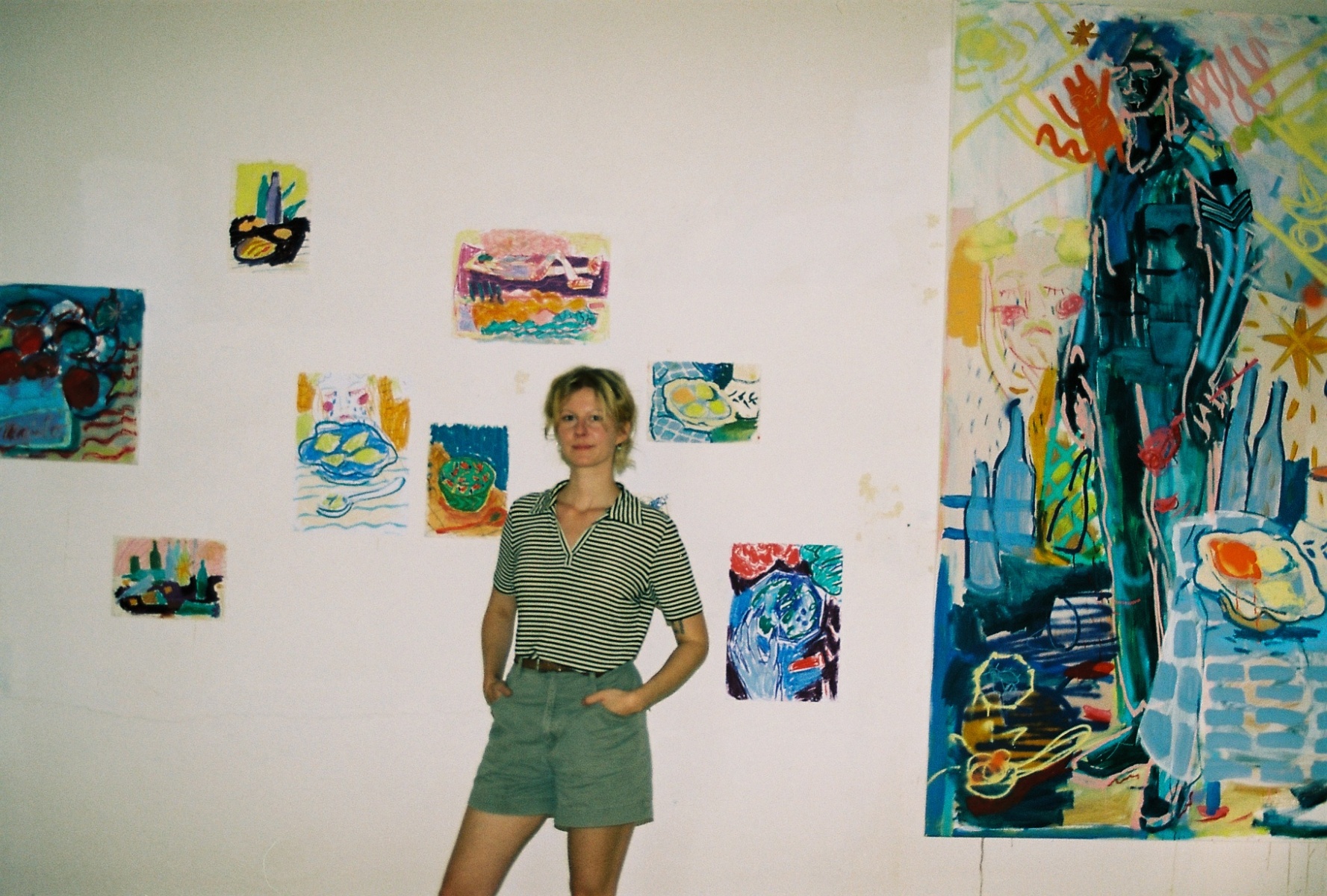 Adina Chmelová so svojimi obrazmi pri inštalácii výstavy na festivale Jinčí čin, Jičín, 2022 – analógová fotografia (foto: Marie Špačková)