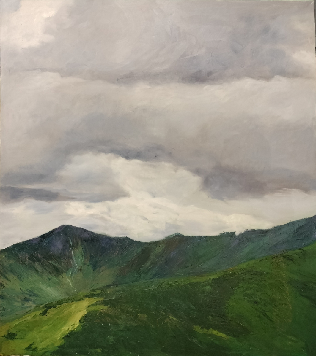Alexandra Pradidová: Šedé tóny mračien, 2025, olej a zemina na plátne, 170x190 cm (foto: archív Alexandra Pradidová)