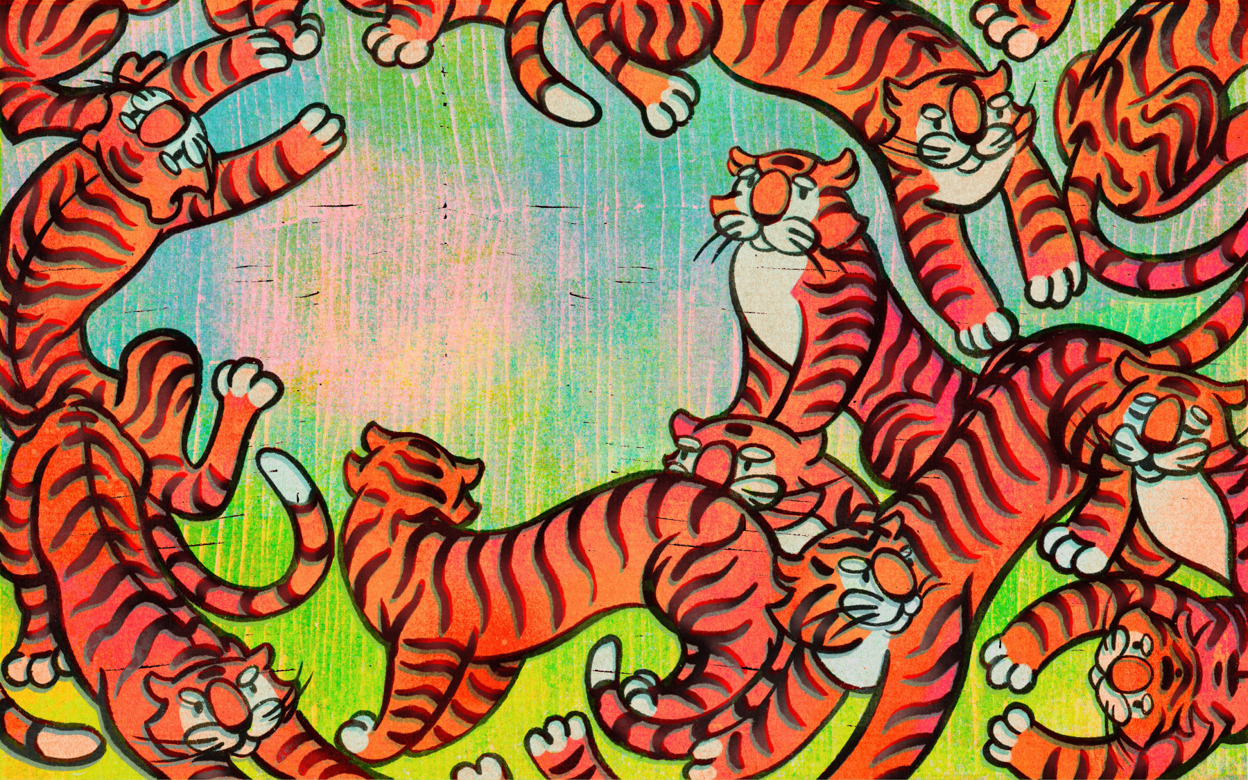 Barbora Lovíšková: O tigrovi, ktorý nemal pruhy, 2021, autorská kniha – digitálna ilustrácia a skenované textúry, 40×25 cm (foto: archív Barbora Lovíšková)