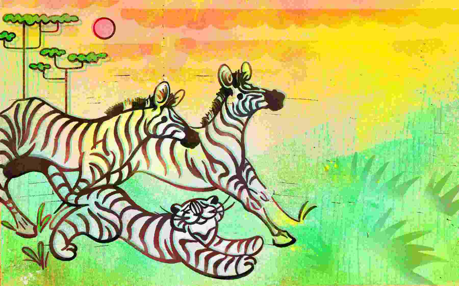 Barbora Lovíšková: O tigrovi, ktorý nemal pruhy, 2021, autorská kniha – digitálna ilustrácia a skenované textúry, 40×25 cm (foto: archív Barbora Lovíšková)