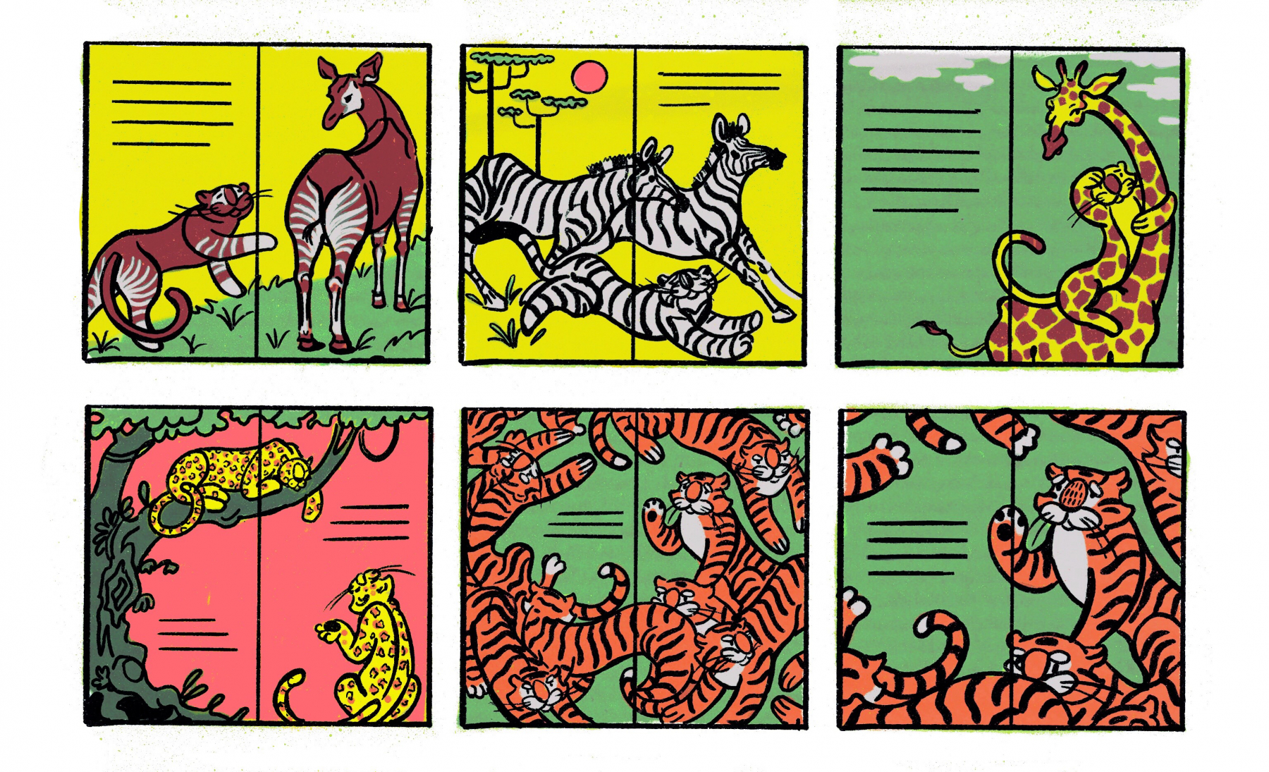 Barbora Lovíšková: O tigrovi, ktorý nemal pruhy, 2021, storyboard – digitálna ilustrácia a skenované textúry (foto: archív Barbora Lovíšková)