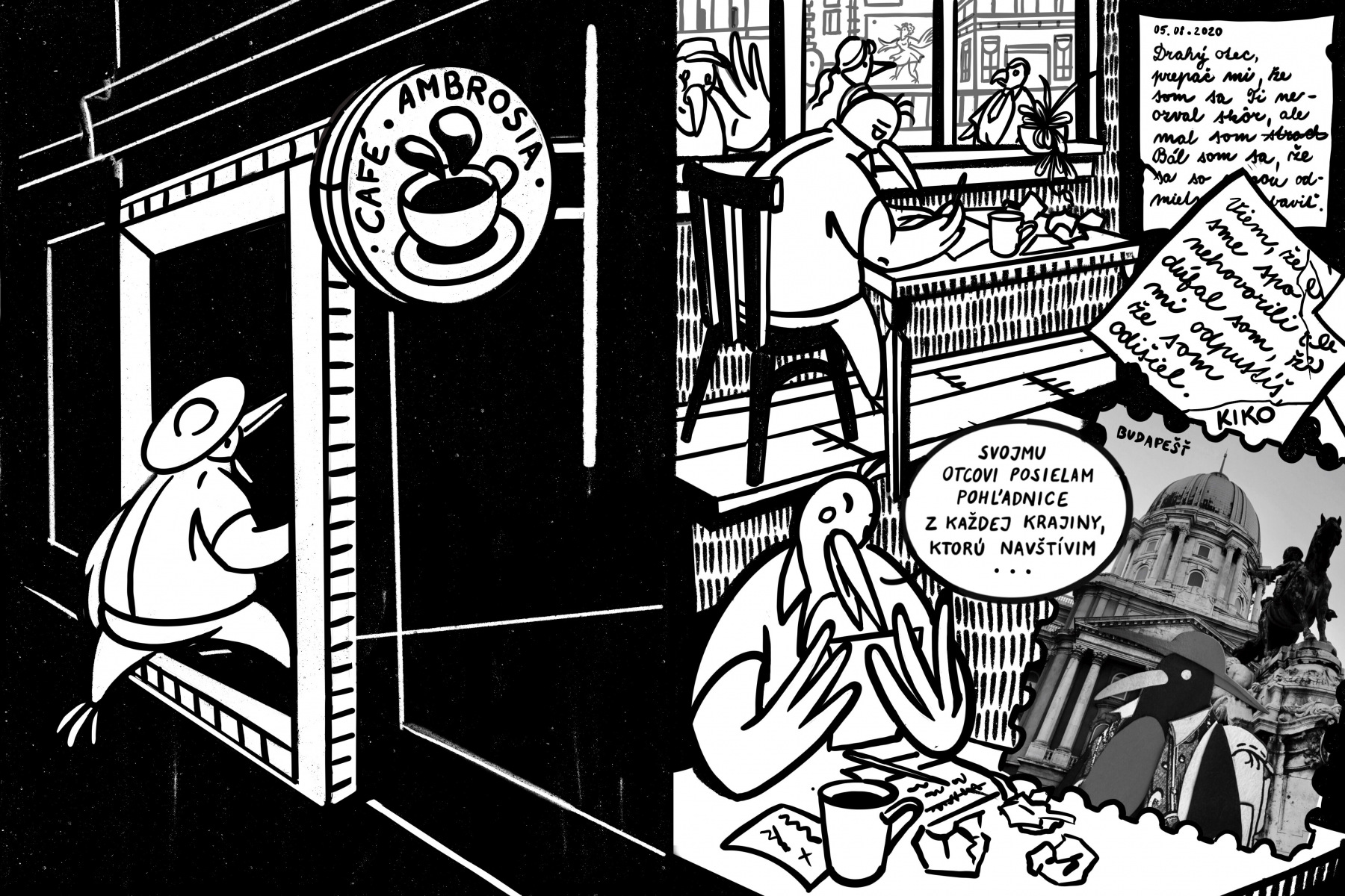 Tento komiks vznikol počas pandémie, keď mnohí ľudia túžili cestovať, no miesto toho museli čeliť napätým rodinným vzťahom. Z týchto situácií som vychádzala aj pri tvorení Kika – vtáčika, ktorý sa rozhodol vyletieť z hniezda navzdory želeniam svojho otca. V príbehu si Kiko na svoju rodinu často spomína a posiela im pohľadnice z miest, ktoré navštívil. Dúfa, že spoločná záľuba vo fotografovaní preklenie pomyselnú i reálnu vzdialenosť, ktorá rodinu rozdeľuje a napraví ich komplikované vzťahy.