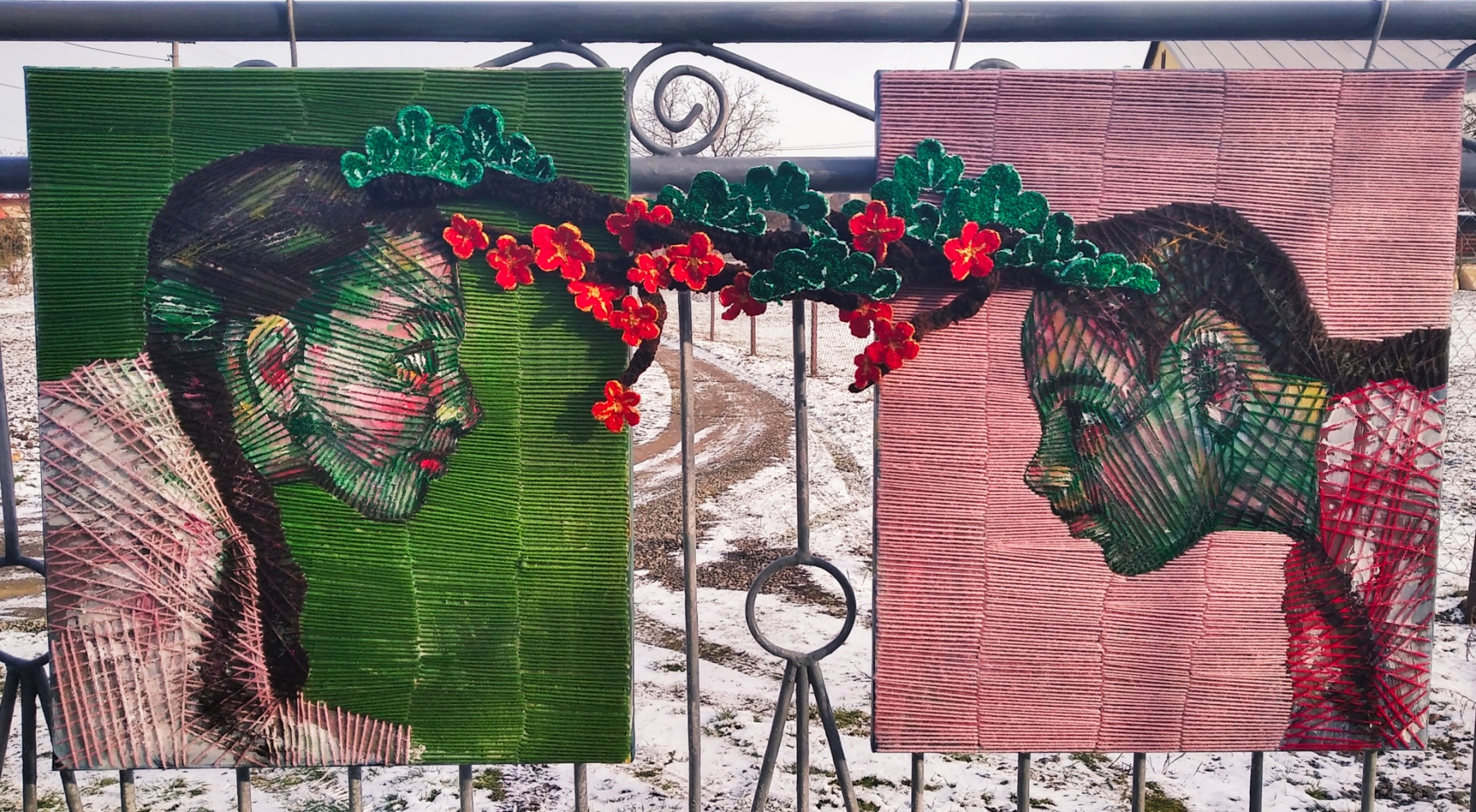Traja priatelia zimy, 2019, kombinovaná technika šitia a maľby (akryl, bavlna) na plátne, 2x plátno 50x40 cm (foto: archív Dominika Brečková)