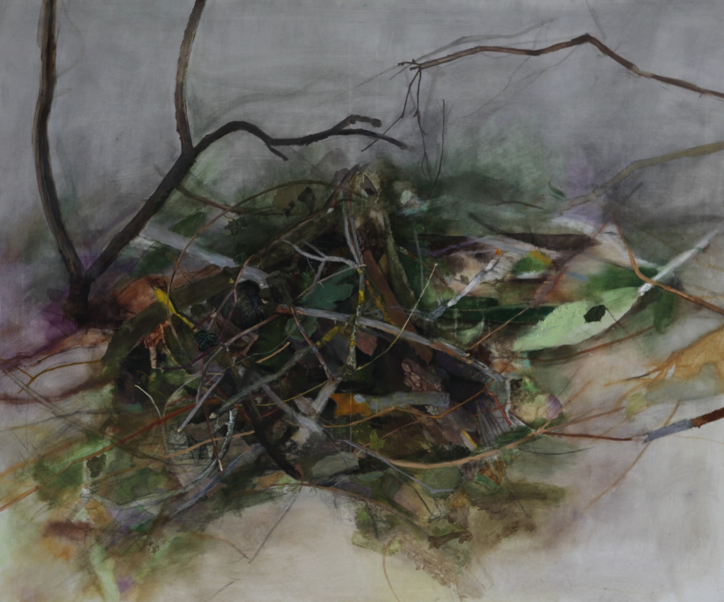Väčšinou v ateliéri. Celý proces sa začína hľadaním a  zozbieraním „materiálu“ akými sú vetvičky, lístie, kôra, hlina. Z nich si v ateliéri vytváram akési prírodné zátišia, na základe ktorých vznikajú maľby. V niektorých prípadoch išlo o voľnejší prepis mojej vlastnej fotografickej predlohy.