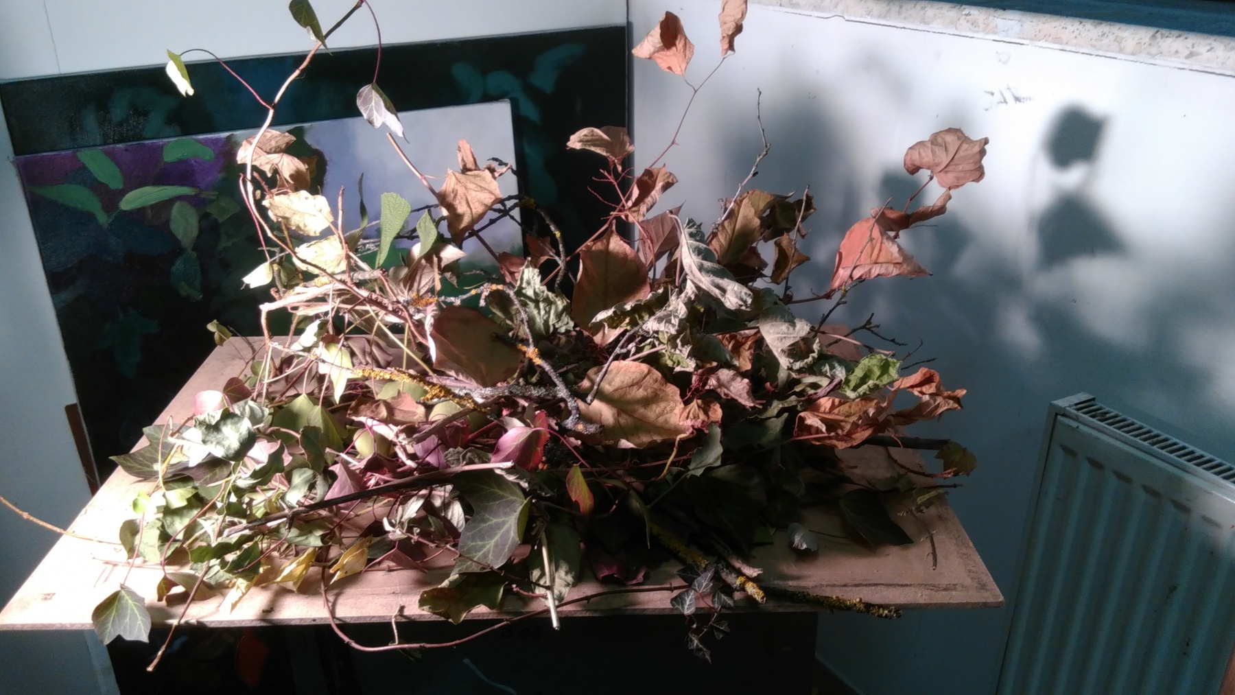 Väčšinou v ateliéri. Celý proces sa začína hľadaním a  zozbieraním „materiálu“ akými sú vetvičky, lístie, kôra, hlina. Z nich si v ateliéri vytváram akési prírodné zátišia, na základe ktorých vznikajú maľby. V niektorých prípadoch išlo o voľnejší prepis mojej vlastnej fotografickej predlohy.