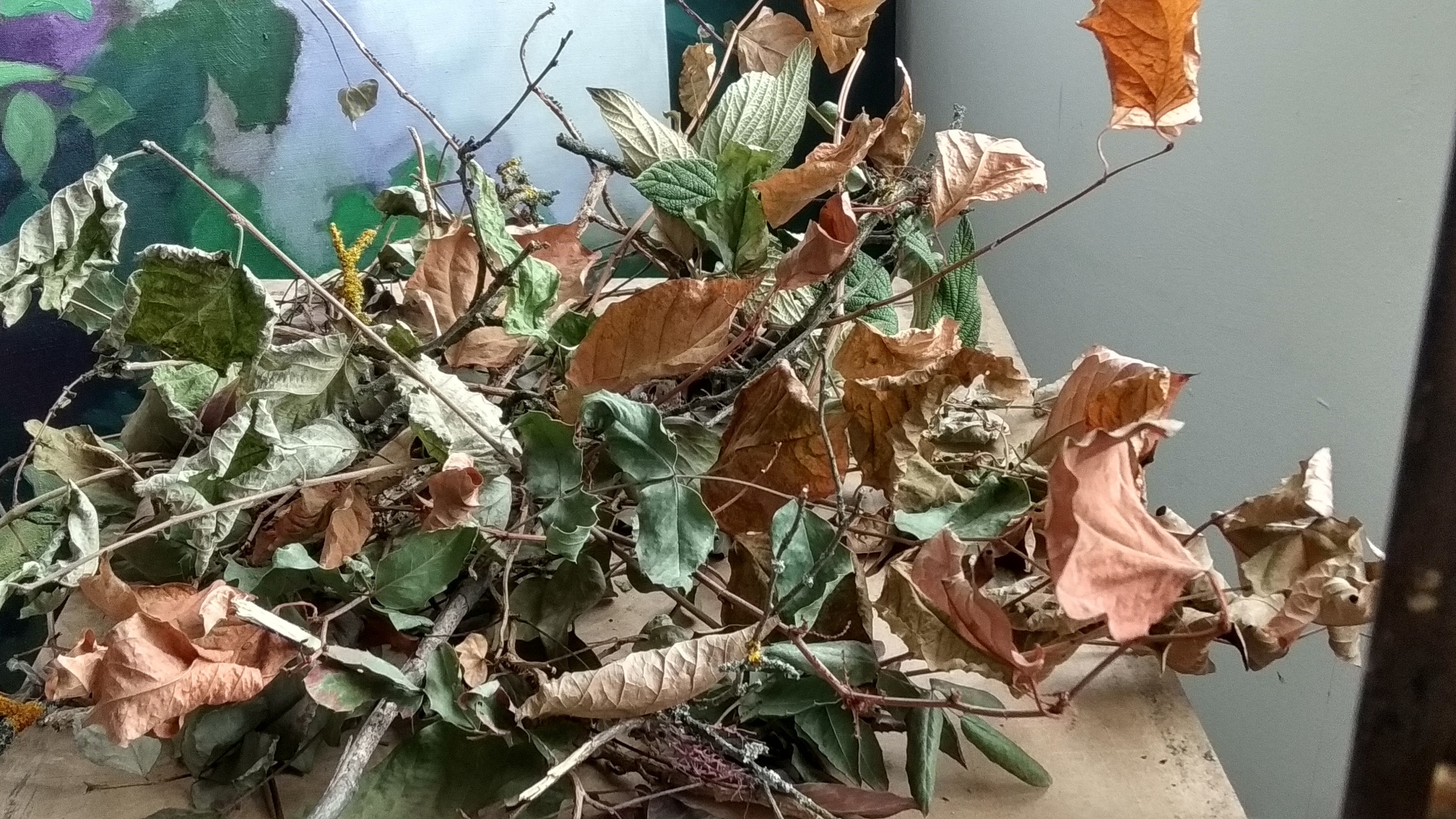 Väčšinou v ateliéri. Celý proces sa začína hľadaním a  zozbieraním „materiálu“ akými sú vetvičky, lístie, kôra, hlina. Z nich si v ateliéri vytváram akési prírodné zátišia, na základe ktorých vznikajú maľby. V niektorých prípadoch išlo o voľnejší prepis mojej vlastnej fotografickej predlohy.