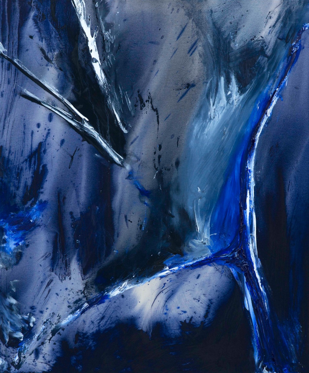 Tvoje obrazy sú prevažne monochromatické, v tmavých odtieňoch, kde dominuje najmä čierna, modrá a biela. Podľa čoho volíš farebnosť svojich obrazov? Symbolizuje prípadne farebnosť tvojich obrazov niečo?