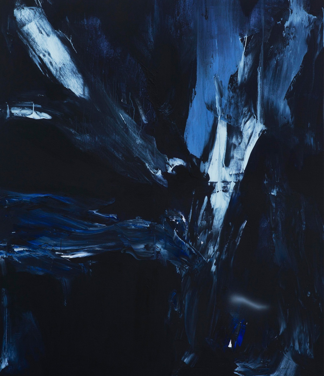 Tvoje obrazy sú prevažne monochromatické, v tmavých odtieňoch, kde dominuje najmä čierna, modrá a biela. Podľa čoho volíš farebnosť svojich obrazov? Symbolizuje prípadne farebnosť tvojich obrazov niečo?