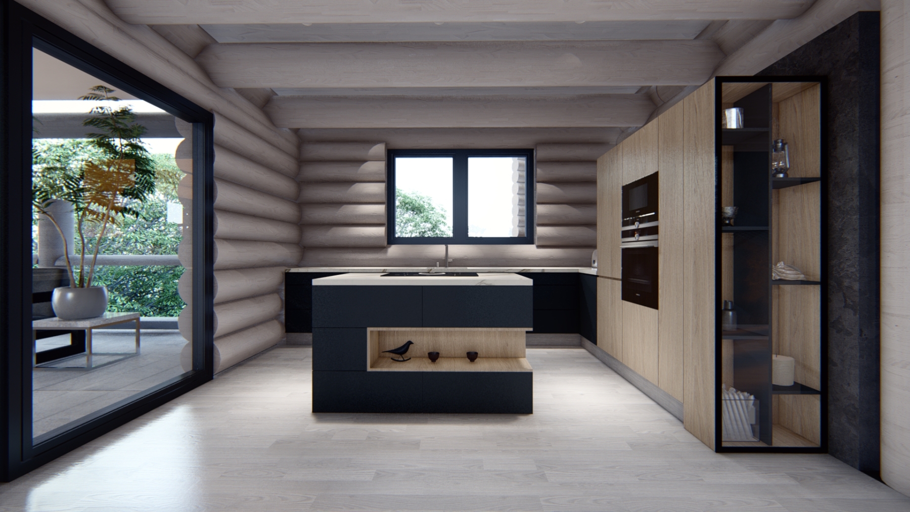Návrh interiéru kanadského zrubu – pohľad do kuchyne, 2021, Hrčava, Česko (návrh vizualizácie: Tatiana Gajdošová – HOME UP DESIGN)