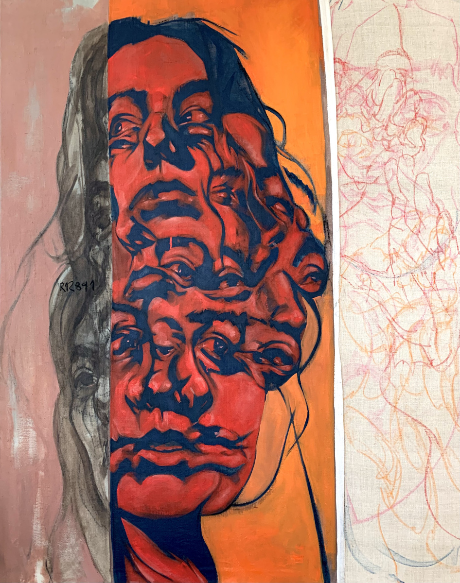 Prvou prácou, ktorú by sme mohli zaradiť do tohto tematického celku, bolo určite dielo Threersona (olej na plátne, 2023), ktorá definovala vizuál série Vzor rozdelenia. Výskum, ktorý je povinnou časťou bakalárskej práce, mi vytvoril priestor skúmať, čo ma naozaj zaujíma. Silno ma fascinuje psychológia človeka, dnes ešte viac i samotná existencia. Je to zrejme moja túžba byť „lepším“ človekom, v zmysle zdravším, viac sebou, plynulejšie fungujúcim. Dostávam sa k týmto témam hlavne vlastným záujmom. Počas školy mi pri nachádzaní vhodnej literatúry veľmi  pomohla podpora Ivany Moncoľovej, ktorá bola teoretičkou mojich oboch prác (bakalárskej a diplomovej).