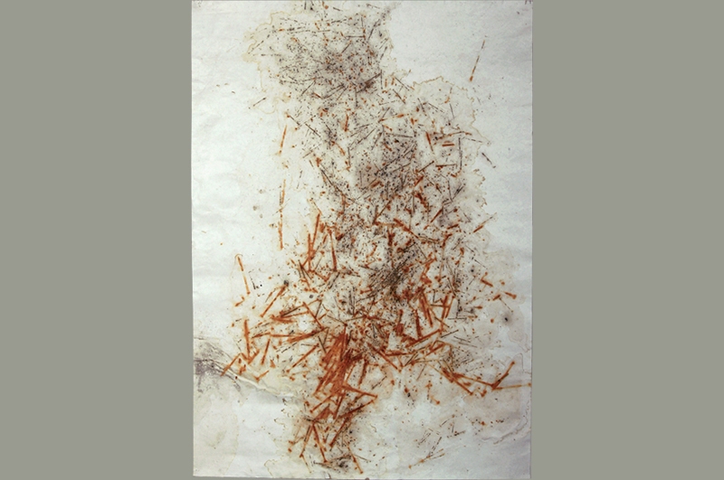 Okrem sochy môžeme u Vás nájsť i kresbu. K nej takisto pristupujete netradične, použitím hrdze, dymu, červenej kapusty či hnijúceho ovocia. Čo v kresbách znázorňujete? Súvisia s Vašou sochárskou tvorbou?