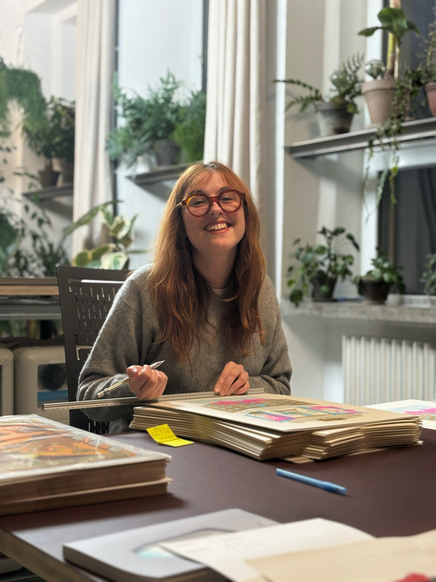 Kristína Babulicová pri podpisovaní svojho diela: Kochovo sanatórium – grafika pre Čierne diery, 2025, 3-farebná risografia, 31x44 cm (foto: archív Kristína Babulicová)