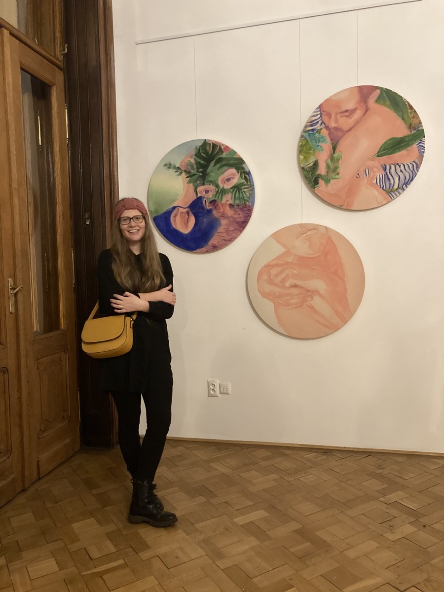 Kristína Vacek pri sérii obrazov s názvom Manželka, 2021, výstava Periférne videnie, Pistoriho palác, Bratislava (foto Barbora Durajová)