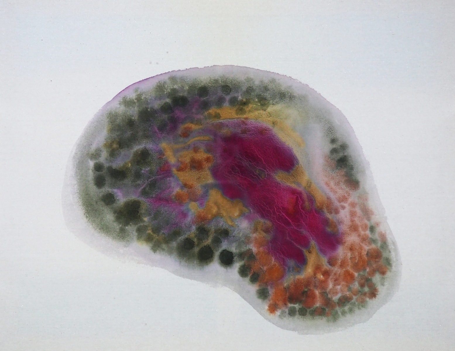 To, že prírodné pigmenty sa po čase na papieri zmenia, som prvýkrát zaznamenala, keď som sa po polroku pozrela na svoju bakalárku. Zrazu som mala pocit, že to nie sú moje maľby. Chvíľu som ostala v nemom úžase. Potom som si všimla, že sa to celé udialo mojím pričinením, ale ešte na samom začiatku, keď maľby vznikali. Išlo o spomínanú zmenu hodnôt pH, kedy som na vytvorenie organických štruktúr použila kyselinu citrónovú a jedlú sódu, dve zložky, ktoré tvoria protiklady, čo sa hodnôt pH týka (kyslé a zásadité). Dôvod, že sa maľby zmenili, nebol ten, že by som použila zlé spojivo pre pigment či inak pochybila, ale práve kyselina citrónová a jedlá sóda pôsobili na maľbách aj dlho po zaschnutí, k čomu v podstate dopomohla len bežná vzdušná vlhkosť v izbe, kde boli maľby uskladnené. Takže fakt, že mi bakalárka trochu „ožila“ ma zaskočilo, ale aj milo prekvapilo. A toto „živé“ odvtedy veľmi rada vkladám do všetkých malieb.