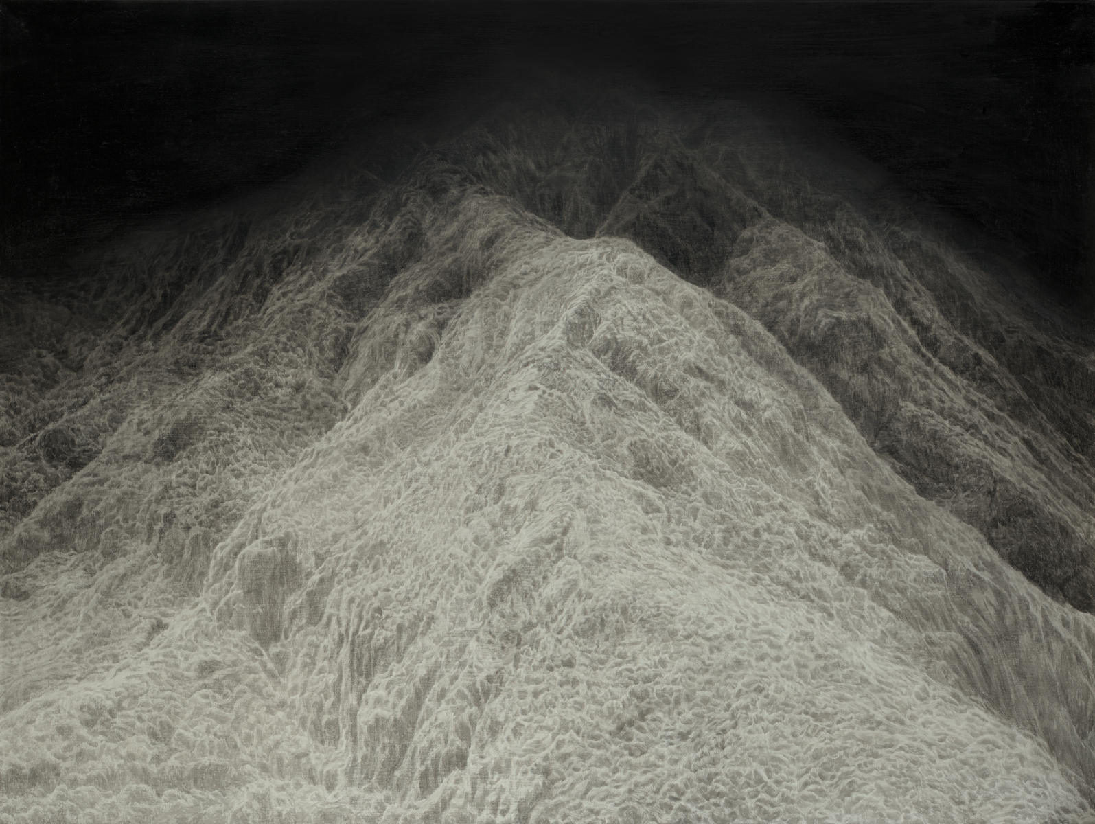 Hora zalita tmou, 2023, tuš na plátne, 160x120 cm (foto: archív Lenka Falušiová)