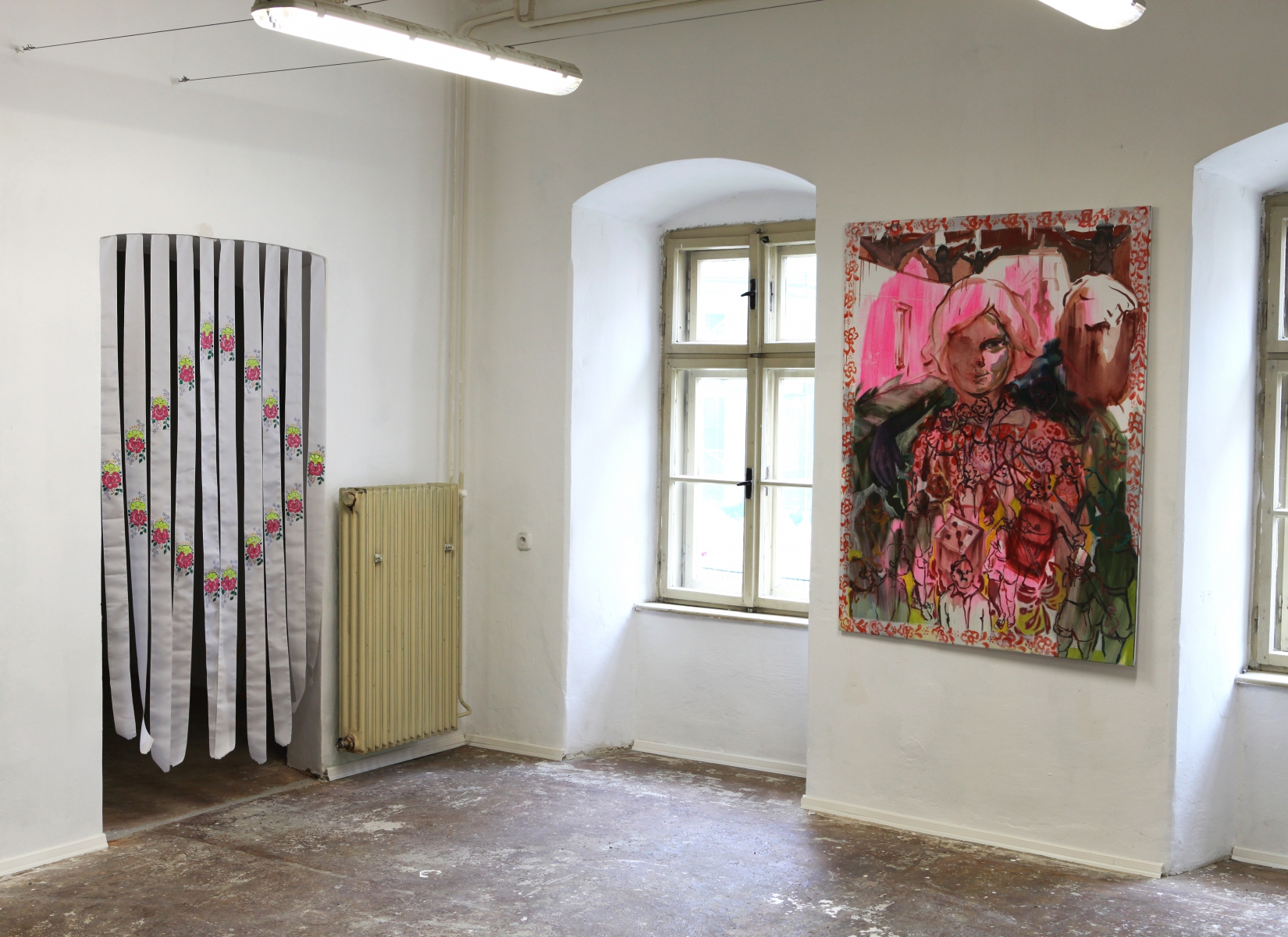 Techniku frotáže som využila na mapovanie priestoru. Frotáže tak zachytávajú čas, to čo sa postupne dialo s kláštorom – ako sa menili jeho účely a využitia. V jednom jeho krídle bolo zriadené kino Hviezda. V týchto priestoroch som triptych zavesila na pódium, v podstate na mieste premietacej plochy. Vznikol Oltár, ktorý v budove po “socíkovskej” prerábke poukazuje na jej prvotný účel. Zároveň však pre mňa multiplikácia jednotlivých frotážovaných predmetov vedie k novým intertextuálnym presahom. Napríklad zdvojenie Ježiša môže otvárať otázky pevnej viery, farizejstva, možnosti koexistencie viacerých vierovyznaní vedľa seba. Ruky dvoch Ježišov sa dotýkajú, môže nás to odkazovať k témam, ktoré sa často najmä pred voľbami otvárajú v konzervatívnejších krajinách, ktorou je aj Slovensko. Sú to témy týkajúce sa LGBTI komunít a podobne. Diptych je zase zavesený v priestoroch bývalej fary, kde je nainštalovaný na garniži, ktorá tu po nej ostala. Multiplikovaný Ježiš tu padá/lieta? dole hlavou. Okolo neho sú ako dekorácie odtlačené zábradlia z cca 18. storočia a tiež poschodia z lešenia, ktoré je súčasťou budúcej prerábky. Významovo sú tieto inštalácie otvorené akejkoľvek inej interpretácii.