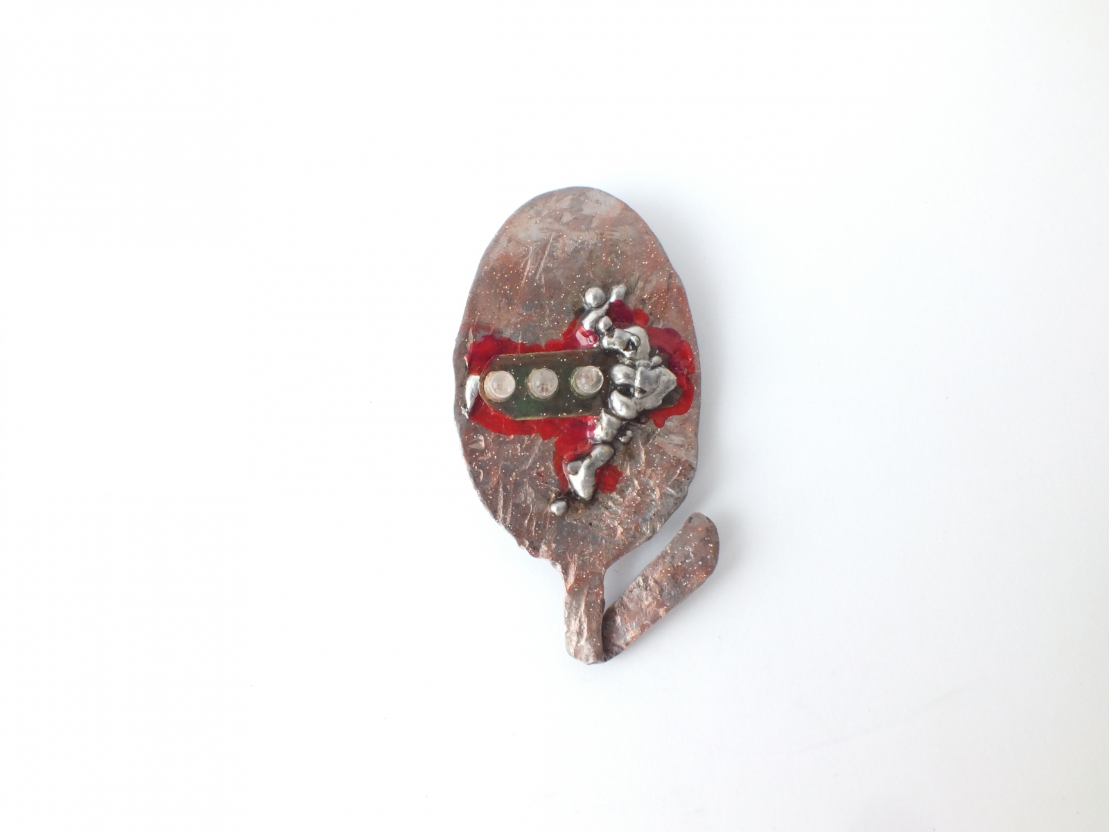 Sĺz je viac než krvi, 2015, brošňa, transformácie – kov, plast, cín, 4,8x9,2 cm (foto: archív Natália Šimonová)