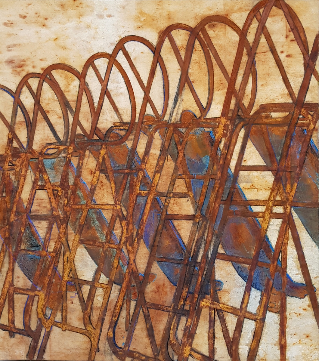 ŠMÝKAČKY, 2020, hrdza, akryl a pastel na plátne, 180 x 200 cm, zo série malieb POST ŠTRUKTÚRA (foto: archív Natália Šimonová)