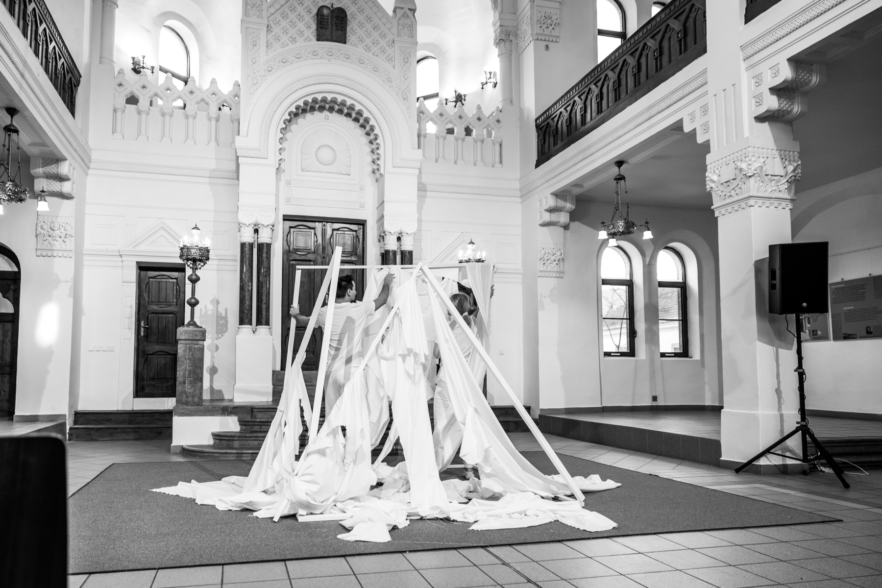 Budovanie ticha, 2022, záznam z performance, Nitrianska Synagóga, Nitra (foto: Radovan Ondruš)
