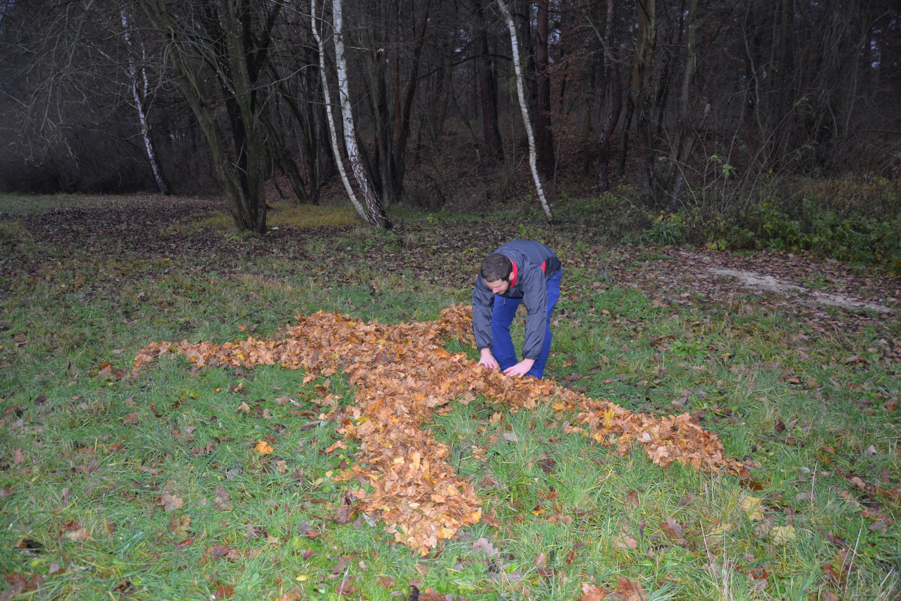 Peter Decheť pripravuje inštaláciu z lístia. Z cyklu Obeť, 2016, inštalácia z lístia, fotografia (foto: Martina Smolková)