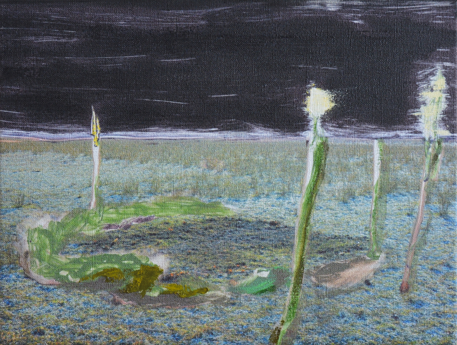 Maľbe predchádzala inštalácia pričom sú to dve autonómne veci. V prípade inštalácie som lístie zapálil. Z toho pochádzajú fotky s popolom, ktoré som „recykloval“ a použil na maľbu Štyri sviece. Nebolo mojím zámerom cielene urobiť inštaláciu pre maľbu. K tomu ma priviedol proces. Postupne došlo k voľnejšiemu spracovaniu a až k forme imaginácie – v prípade maľby pod názvom Obeť (4). Skratkovito zaznamenaná obeť v plameňoch je situovaná do momentu možnej záchrany. Človeka (život) som umiestnil na hranicu, kde sa stretajú dva živly: voda a oheň.
