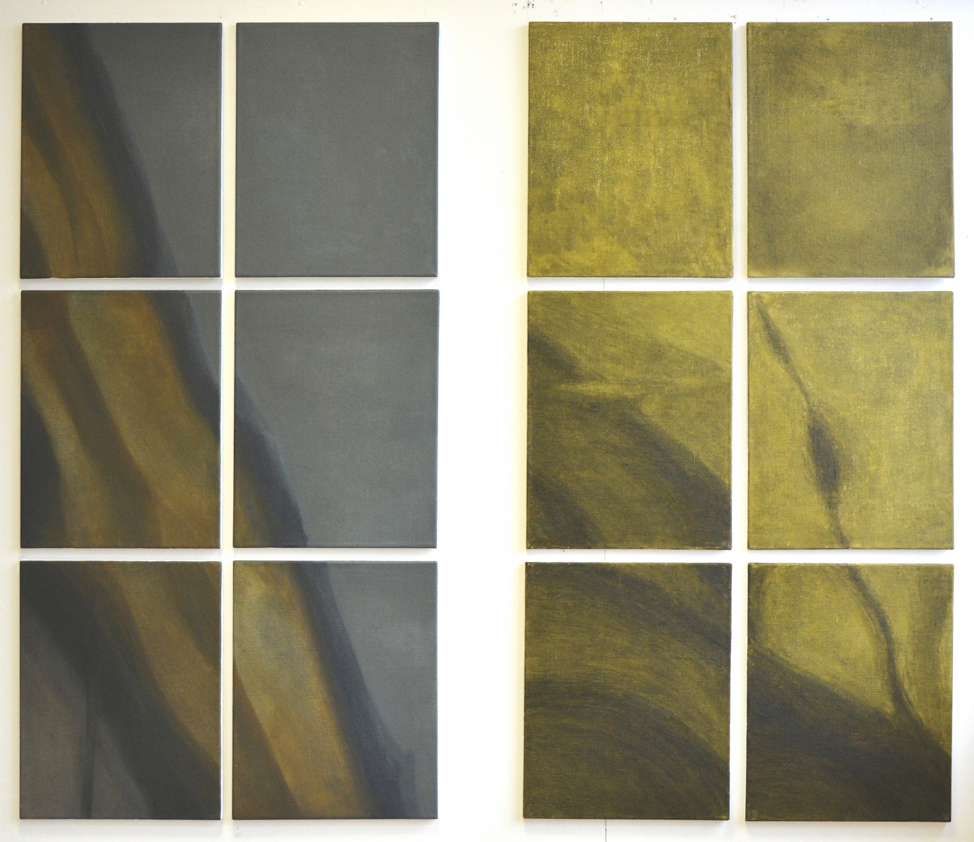 Deformácia architektúry č.1 a č.3, 2017, olej na plátne, dvakrát po 6 formátov 40 x 50 cm (foto: archív Peter Decheť)