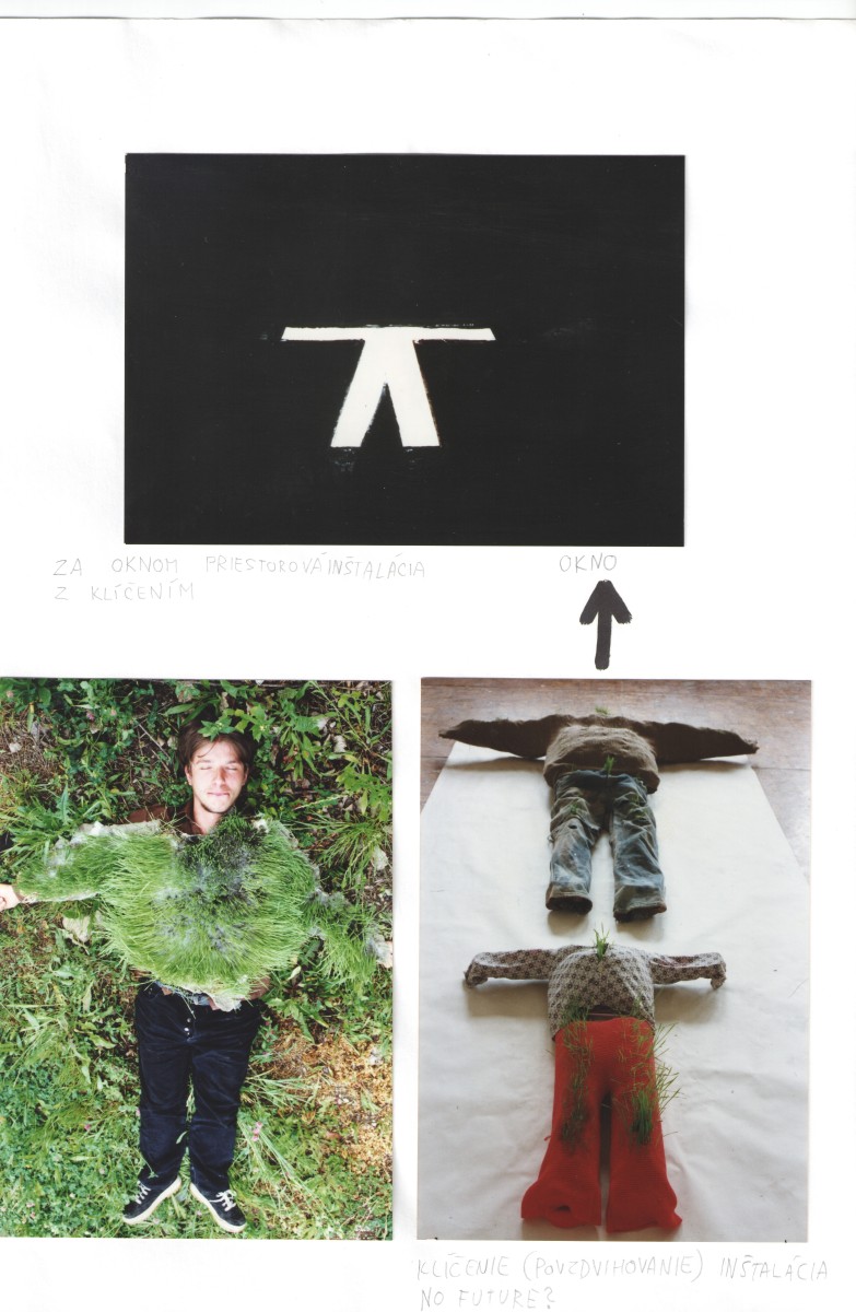 Inštalácia pozostávala z mojich detských šiat (útle detstvo), ktoré tiež nabrali skrz zasedených semien objem a následne prechod von. V druhej časti to bol sveter z reálneho času, ktorý som si obliekal. Von pod školou som pripravil záhradku – políčko v tvare ležiacej postavy. Podobne, ako bolo rozloženie tých detských šiat, som tam následne na prezentácii naživo sial pšenicu symbolizujúcu „moju budúcnosť“.