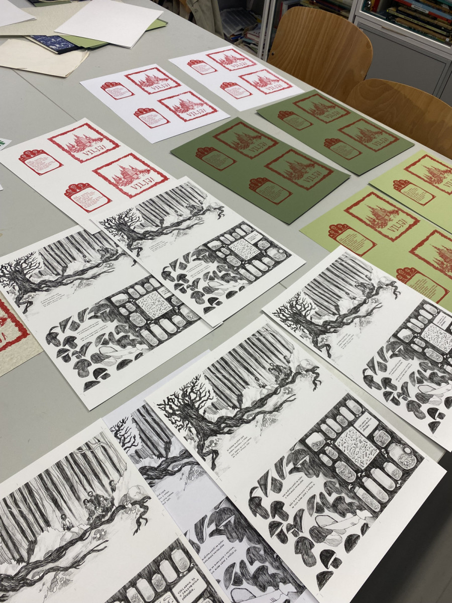 Prvý semester bol pre mňa silná zmena, nielen presunom zo strednej školy na vysokú, ale taktiež zameraním. Bola som zvyknutá sedieť za knihami a učiť sa hodiny denne. Za čo som vďačná, lebo kvôli tomu som mala naozaj veľa motivácie pre toto zadanie. Mám viacerých spolužiakov, ktorí predtým študovali na gymnáziu, čiže sme sa vedeli povzbudzovať navzájom v novej etape života. Samotné kreslenie som si užívala. Na odporúčanie spolužiakov, ako i Evy som sa naučila pracovať s farbou v kontraste s mojou charakteristickou čiernou perokresbou. Vyskúšala som si takisto akvarel. Ťažšie bolo ilustrácie graficky upraviť a následne pripraviť na tlač. Prvýkrát som sa stretla s Photoshopom a Indesignom. Rozhodla som sa knižku sama orezať aj zviazať, s čím som taktiež  nemala skúsenosť. Vďaka tomuto zadaniu som sa naučila všetky základne veci okolo ilustračnej tvorby.