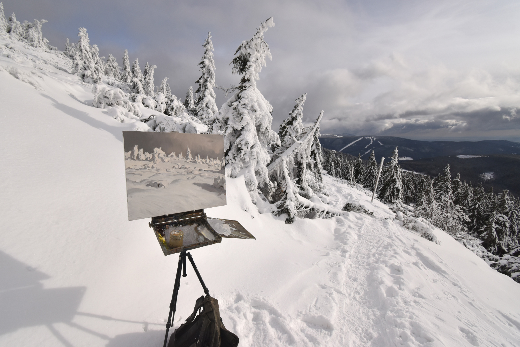 Krkonoše v zime a maľba Tomáša Honza, 2023 (foto: archív Tomáš Honz)