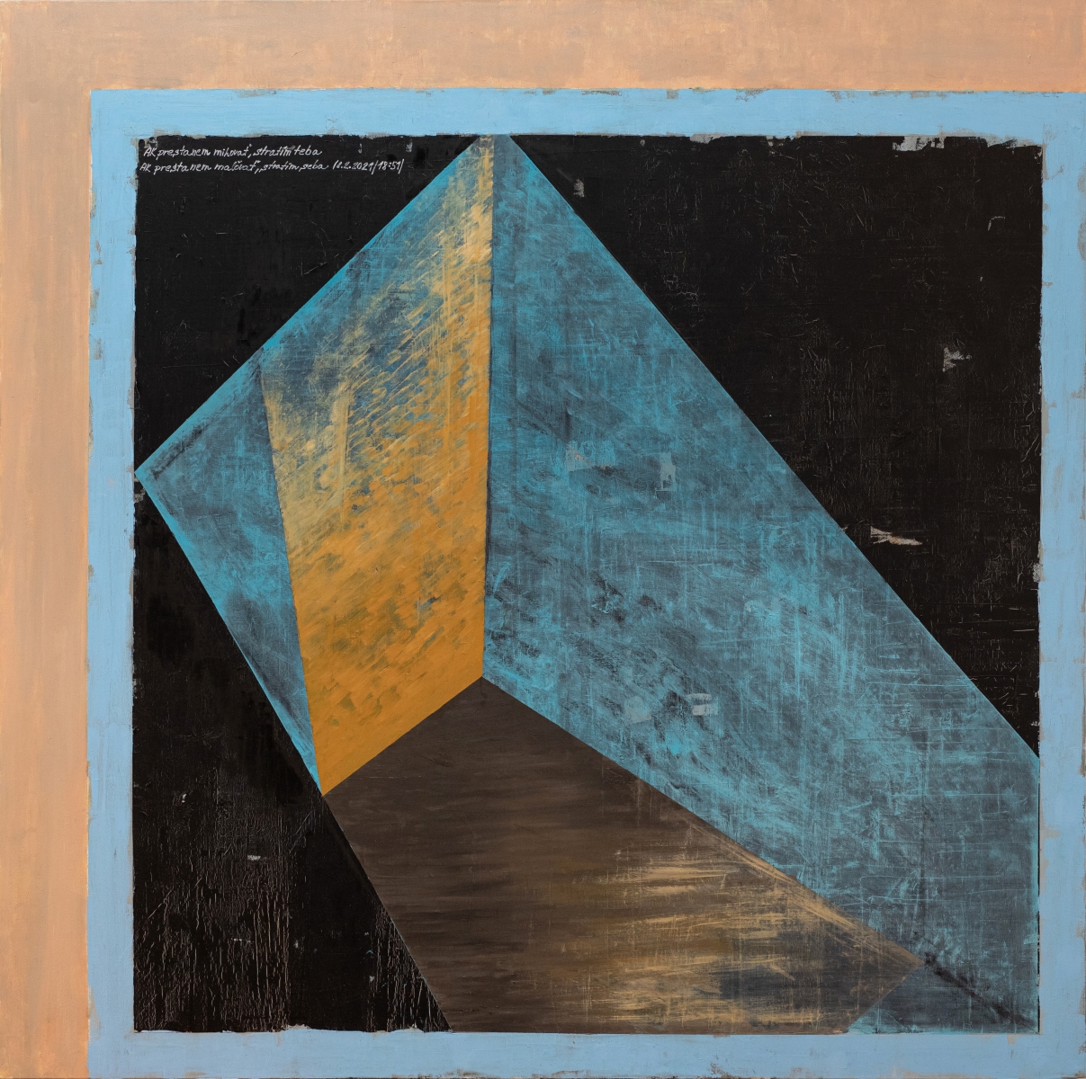 Sivý priestor (ak prestanem milovať teba, ak prestanem maľovať stratím seba), 2021, olej na plátne, 120x120 cm (foto: Michal Zahornacký)