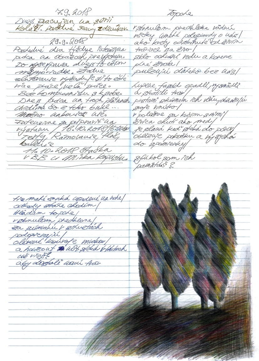 Vznikajú tam moje básne. Na tie básne vznikli konkrétne obrazy napr. Splývanie. Takže svojim obsahom sú rôznorodé a pre mňa bohaté. Mapujú to, čo som prežil. Je to zaujímavé občas si niečo prečítať spätne, keďže ja si všetky zápisky označujem dátumom s presným časom. Občas ich viem vystaviť iba také, aké sú. Ľudia si v nich môžu len tak listovať.