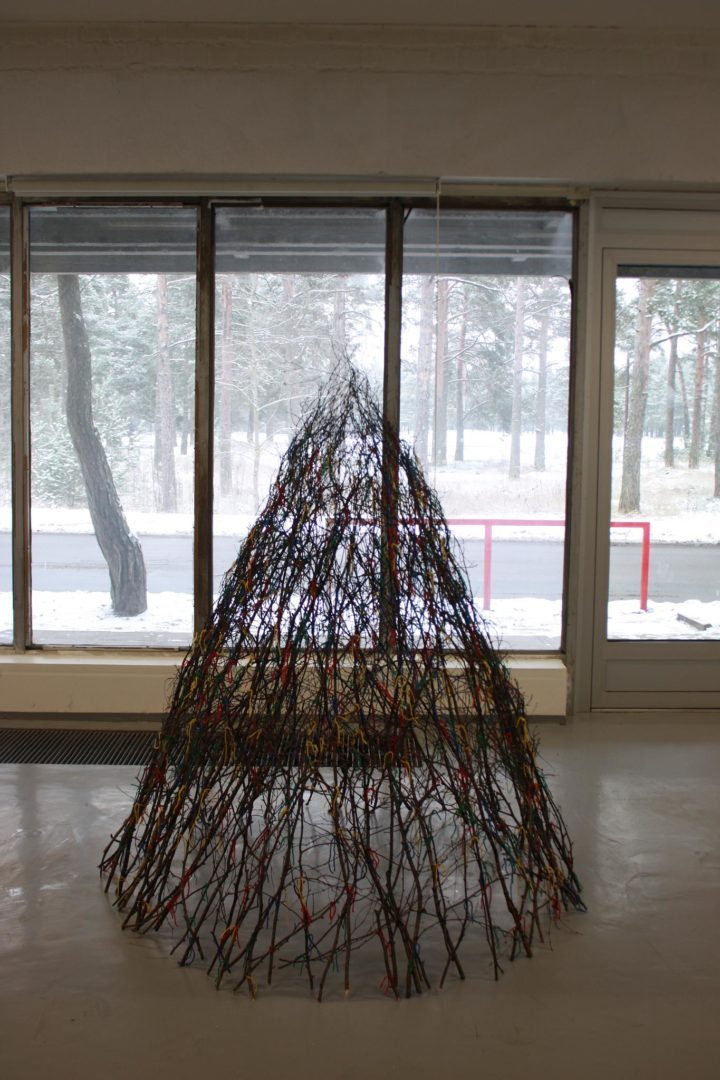 Zuzana Bartošová: Větvení, 2014, inštalácia – vetvy stromov, vlna, výška 2m. Vystavené na spoločnej výstave študentov ateliéru Installation and Sculpture s názvom Under one Umbrella, 2014, Raja gallery, Estonian Academy of Arts Tallinn, Estónsko. (foto: archív Zuzana Bartošová)